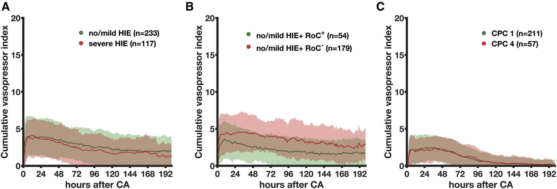 Association between the cumulative vasopressor index and the severity of hypoxic–ischemic encephalopathy evaluated by histopathology in non-survivors and neurological status in survivors. The association between the CVI as mean (bold line) with simple standard deviation (transparent area) and severity of HIE stratified by histopathology (A), regain of consciousness (B), and neurological status (C) is shown. MAP, mean arterial blood pressure; CA, cardiac arrest; HIE, hypoxic–ischemic encephalopathy; RoC+, regain of consciousness present; RoC−, never regained consciousness; CPC, cerebral performance category.