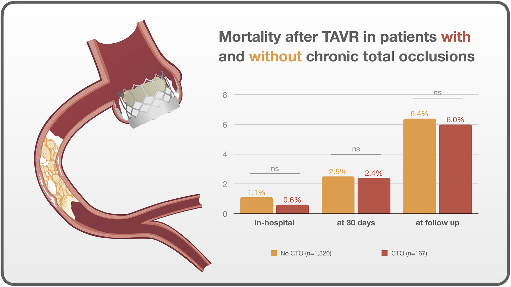 Coronary artery disease (CAD) is a common finding in patients with severe aortic stenosis undergoing transcatheter aortic valve replacement (TAVR). However, the impact on prognosis of chronic total occlusions (CTOs), a drastic expression of CAD, remains unclear.