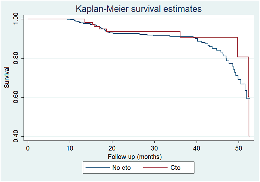 Table 2 presents the procedural variables and outcomes of patients who underwent TAVR with and without CTO. The median procedure time was similar in both groups, with a median of 27 min [interquartile range (IQR): 22–36] in the no CTO group an IQR: 22–37 in the CTO group (p = 0.83).