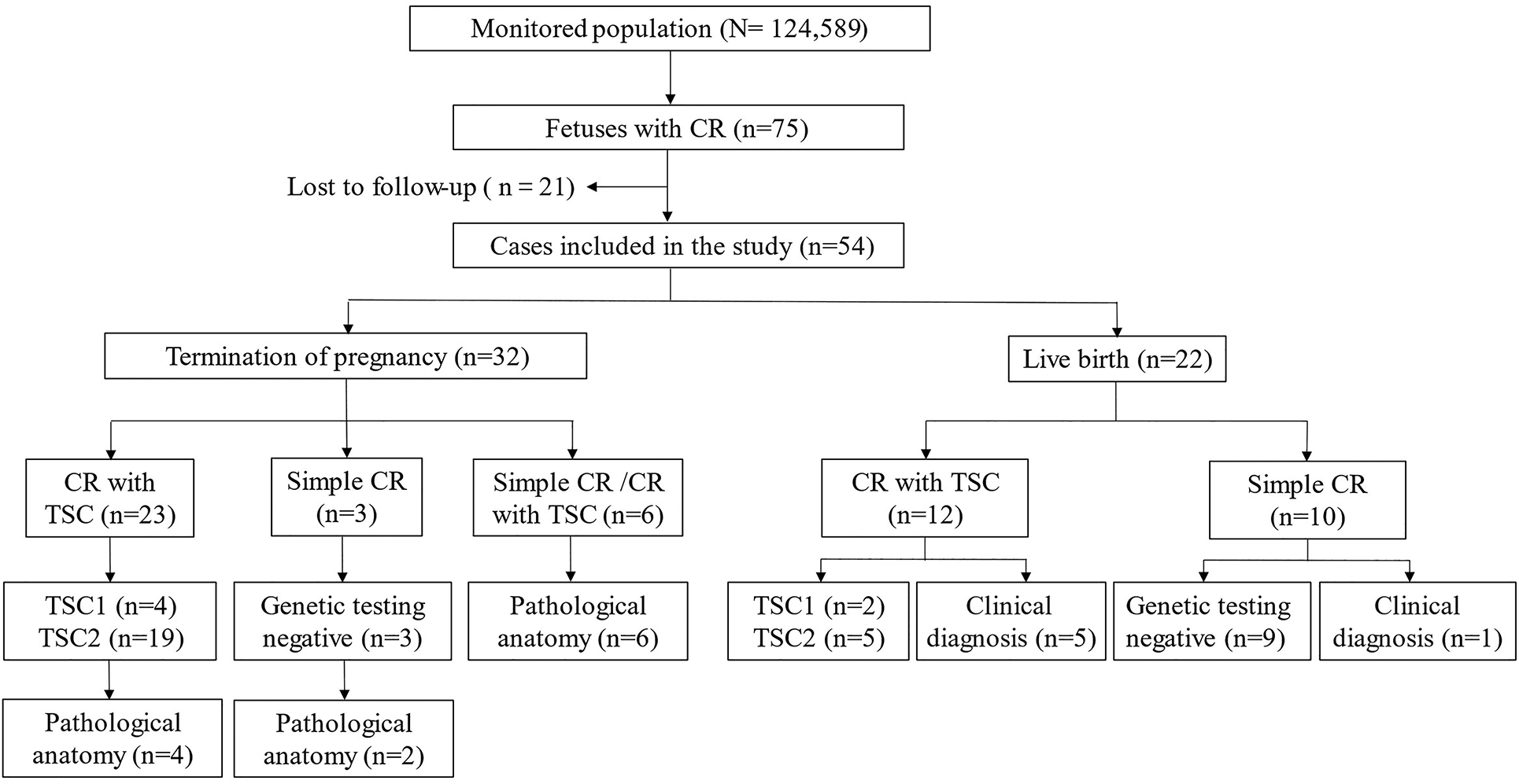 In cases of pregnancy termination, anatomical and pathological examination were conducted to verify the diagnosis after obtaining informed consent and signature from patients and their family members. For newborns with cardiac tumors in our hospital, CR was confirmed through repeated clinical follow-up after birth. Children diagnosed with TSC underwent skin and eye examinations, abdominal ultrasonography, assessment of seizures, and brain MRI. Additionally, evaluations were performed for mental and psychomotor development, as well as behavioral and language skills. All children in the study received regular followed up by a pediatrician and an ultrasound physician. Those who declined to participate or could not be reached more than three occasions were considered lost to follow-up.