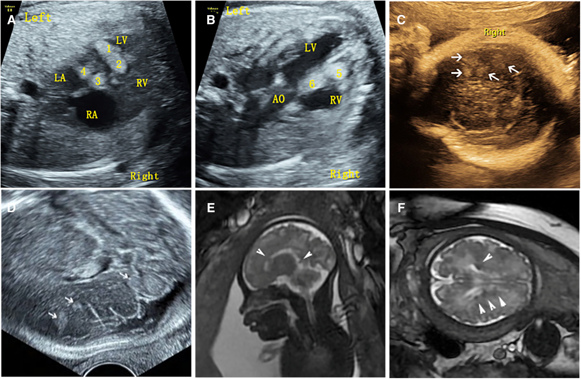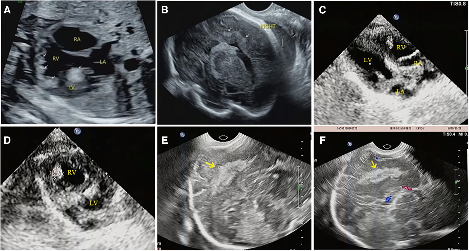 Prenatal and postnatal ultrasonography of cardiac rhabdomyoma complicated with cranial sclerotic nodules in case NO. 13. (A) Multiple slightly hyperechoic nodules in the ventricle of the fetal heart at 28 weeks of gestation. (B) Multiple hyperechoic intracranial nodules of the fetal heart at 28 weeks of gestation; however, no intracranial lesions were detected by MRI at the same time. (C,D) Multiple slightly hyperechoic nodules in the ventricle of the baby at 1 month after birth. (E,F) Hyperechoic intracranial nodule of this baby at the same time.