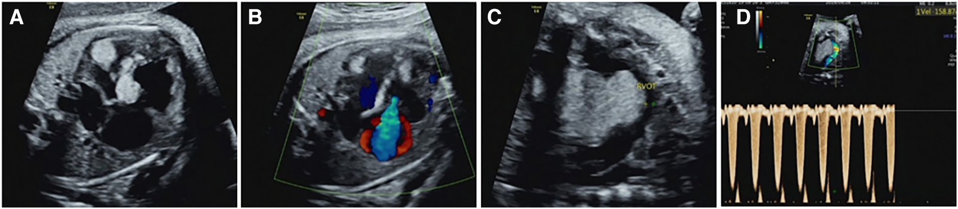 Intracardiac complications associated with cardiac rhabdomyoma in the fetus (case NO. 54) at 33 weeks of gestation. (A) Heart failure with cardiothoracic ratio enlargement. (B) Severe tricuspid regurgitation. (C) Rhabdomyoma located in the upper interventricular septum protrudes into the right ventricular outflow tract, resulting in a reduced internal diameter of the right ventricular outflow tract. (D) Increased velocity of the right ventricular outflow tract.