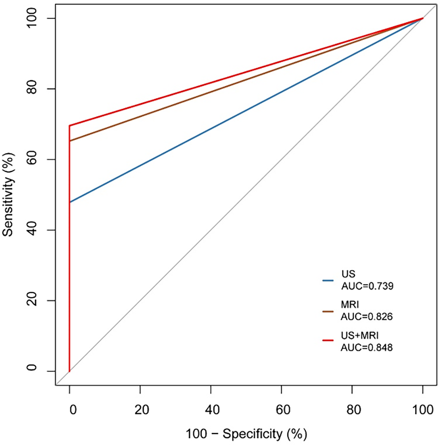 | US&MRI | 0.848 (0.670, 0.952) | 69.57 (47.1, 86.8) | 100 (85.2, 100.0) | 76.7 (57.7, 90.1) | 50 (23.0, 77.0) |