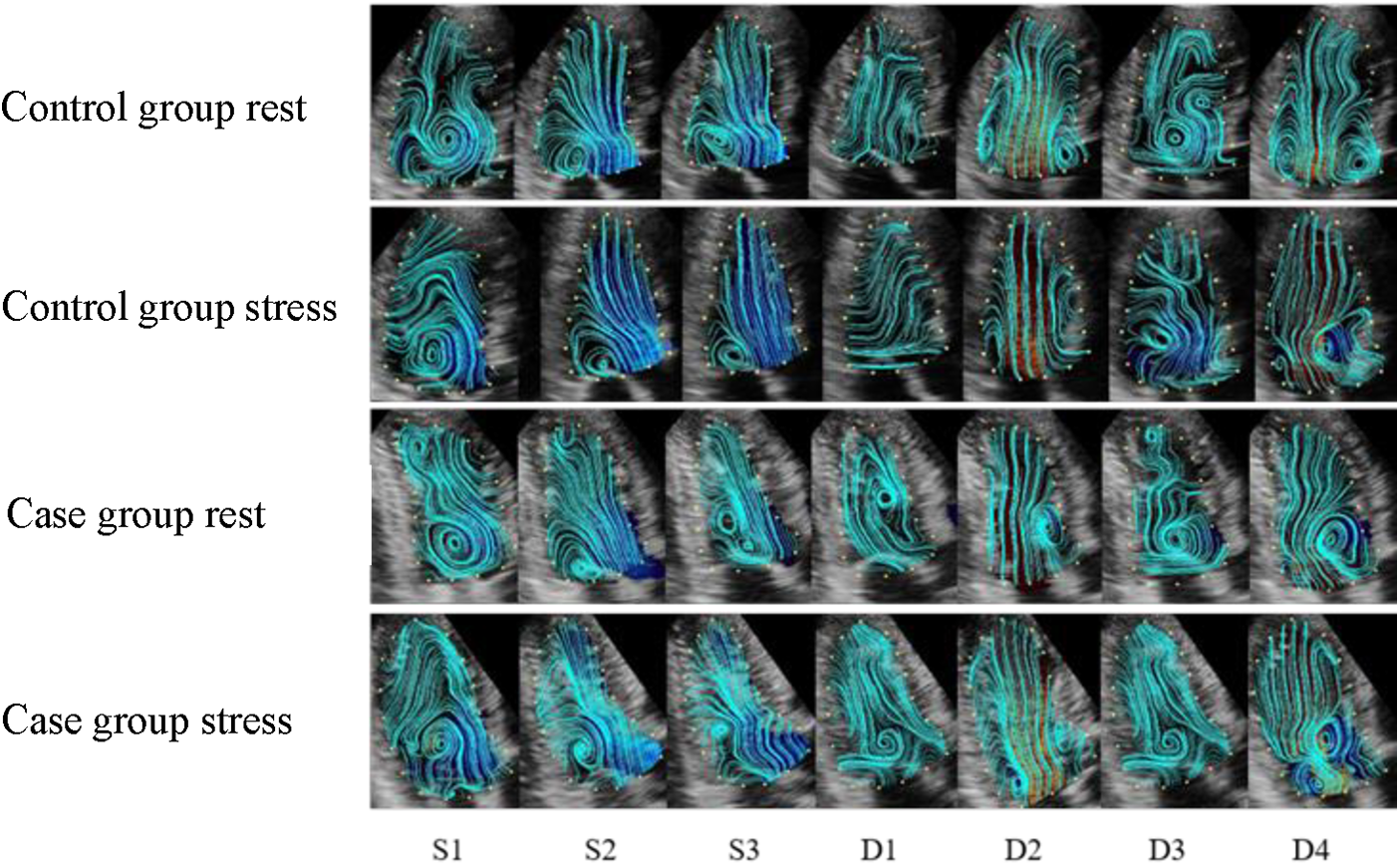Overall, 34 patients with nonobstructive (<50%) left anterior descending coronary artery stenosis (case group) and 36 patients with no coronary artery stenosis (control group) were included. Apical four-, three-, and two-chamber echocardiographic images were collected at rest and during early recovery from treadmill exercise. LV flow field, vortex area, and circulation (cir) changes were recorded in different phases: isovolumetric systole (S1), rapid ejection (S2), slow ejection (S3), isovolumetric diastole (D1), rapid filling (D2), slow filling (D3), and atrial systole (D4). Intra- and inter-group differences were compared before and after exercise loading.