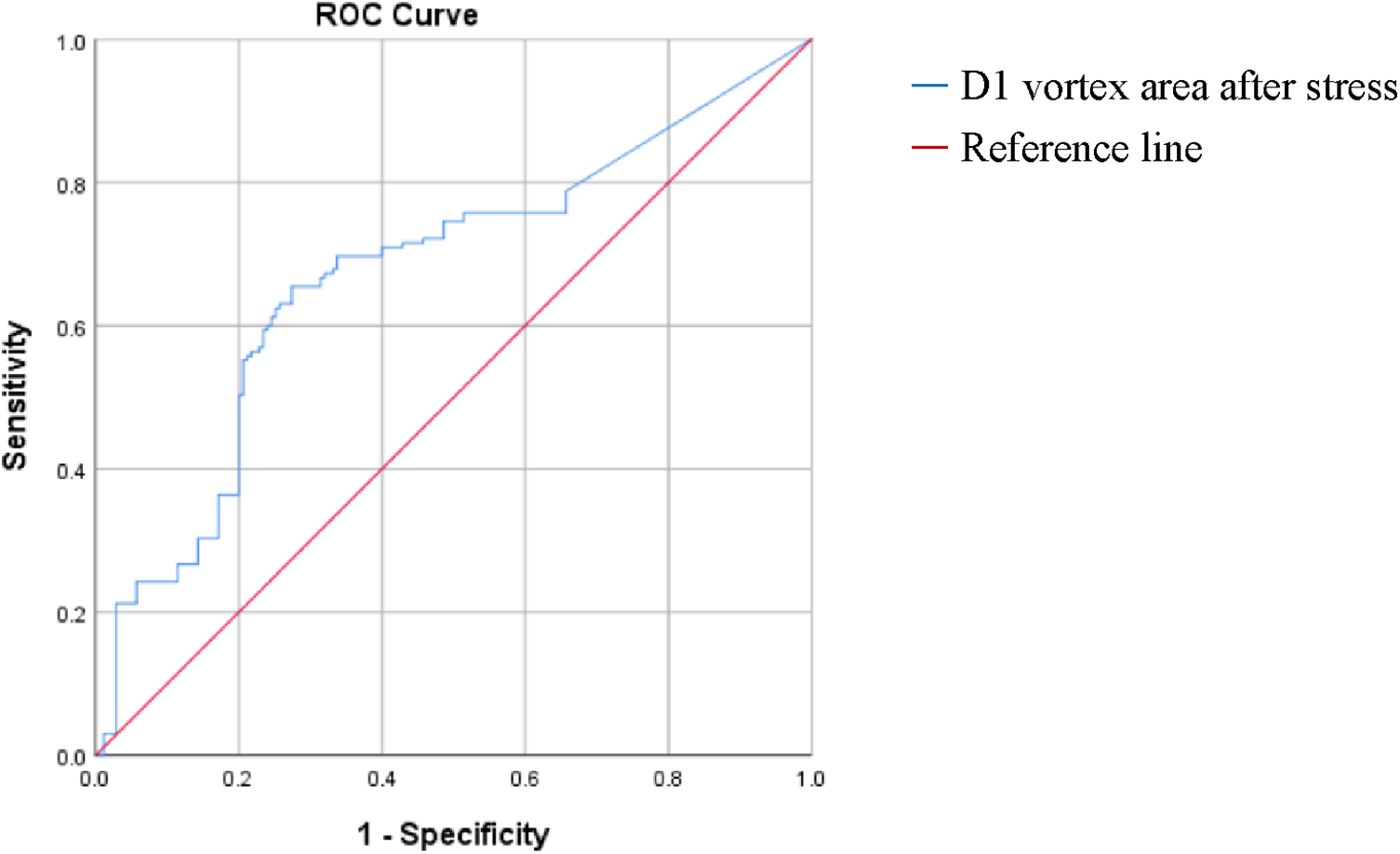 The control and case groups demonstrated regular trends of eddy current formation and dissipation at rest and under stress. Compared with the control group, the case group had irregular streamline distributions. Abnormal vortices formed in the S1 and D3 apical segments and D1 left ventricular middle segment in the resting group. Compared with the control group, the resting group had decreased left ventricular S1 vortex areas and increased S3 vortex areas. The post-stress D1 and D3 vortex areas and D1 and D2 cir increased. Compared with at rest, after stress, the control group had decreased S1, S3, D2, and D3 vortex areas; increased S2, D1, D3, and D4 cir; and decreased D2 cir. After stress, the case group had decreased S3 and D2 vortex areas, increased D1 vortex areas, and increased S2, D1, D3, and D4 cir (P all < 0.001). Logistic regression and ROC curve analyses show that increased D1 vortex area after stress is an independent risk factor for stenosis in nonobstructive stenosis of coronary arteries (OR: 1.007, 95% CI: 1.005–1.010, P < 0.05). A D1 vortex area cutoff value of 82.26 had an AUC, sensitivity, and specificity of 0.67, 0.655, and 0.726, respectively.