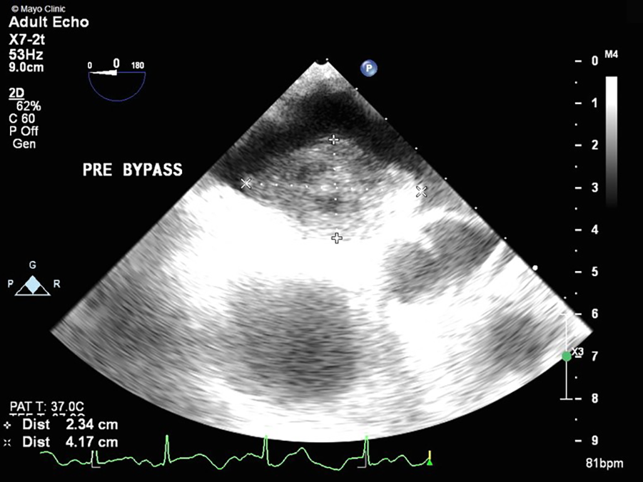 TEE showing a large mass (2.3 cm × 4.2 cm) with attachment to the left atrial side of the atrial septum.
