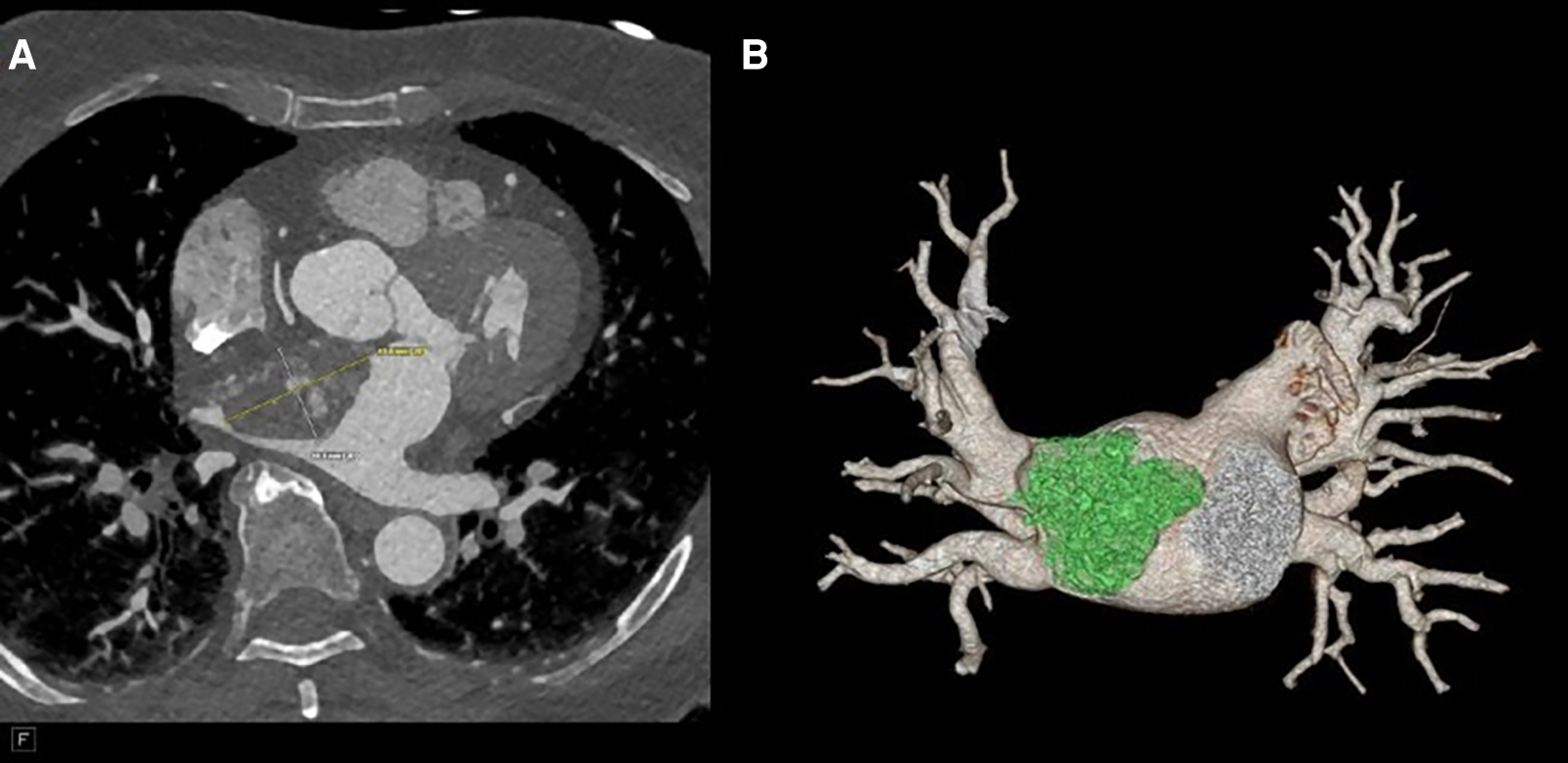 (A) CTA revealing a 41 mm × 27 mm × 33 mm broad-based lobulated mass in the left atrium that extends into the mitral annulus. (B) CTA reconstruction to show the mass extending to the right upper pulmonary vein (RUPV).