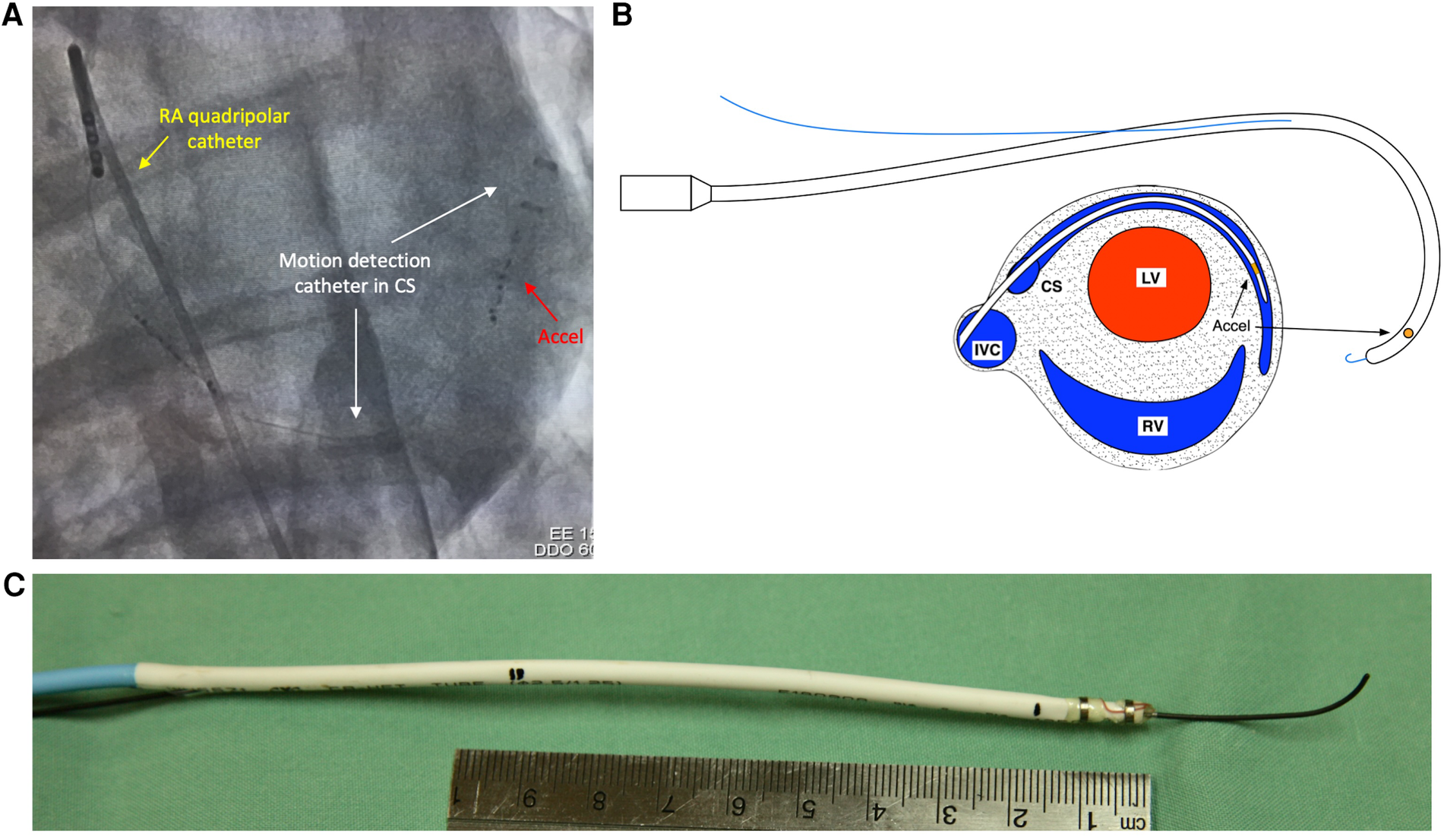 Fluoroscopic appearance and design of motion detection catheter. (A) Fluoroscopic appearance of motion detection catheter positioned in coronary sinus. White arrows—motion detection catheter positioned in coronary sinus from right internal jugular approach. Red arrow—accelerometers situated at distal tip of motion detection catheter. Yellow arrow—Quadripolar electrophysiological catheter positioned in right atrium. (B) Top—diagrammatic representation of motion detection catheter with 0.035” J-wire fed through rapid exchange monorail port. Bottom—cross sectional schematic of heart depicting positioning of motion detection catheter in coronary sinus. (C) Photograph of motion detection catheter with 0.035 “ J-wire fed through rapid exchange monorail port. Pictured with 10-cm ruler for scale. Accel, accelerometers; CS, coronary sinus; LV, left ventricle; RA, right atrium; RV, right ventricle; SVC, superior vena cava.