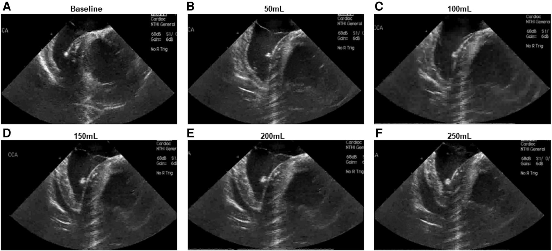 Intracardiac echocardiographic appearance of developing pericardial effusion. (A) Baseline appearance (B–F) Appearance following infusion of (B) 50 ml (C) 100 ml (D) 150 ml (E) 200 ml (F) 250 ml.