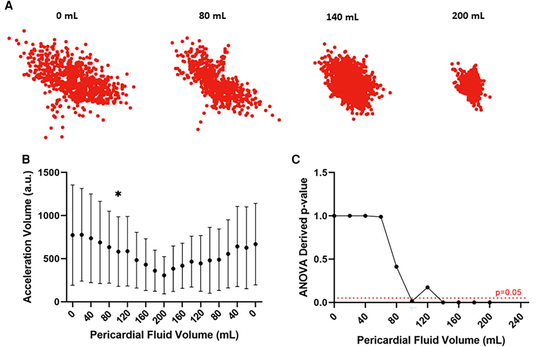 Motion detection catheter data from representative ovine subject. (A) Scatter plots depicting the displacement of the motion detection catheter over different experimental conditions. Reduced displacement of the catheter with increasing pericardial fluid collection. (B) Acceleration volume over different experimental conditions. Reduction in acceleration volume with increasing pericardial fluid collection which increases when fluid is removed. Statistically significant change in acceleration volume from baseline noted after infusion of 100 ml of pericardial fluid. *p value < 0.05, ANOVA (C) Line graph depicting ANOVA derived p values of acceleration volume compared to baseline across different experimental conditions. Statistically significant change (p < 0.05) in experimental volume compared to baseline detected following infusion of 100 ml of pericardial fluid. a.u.: arbitrary units.