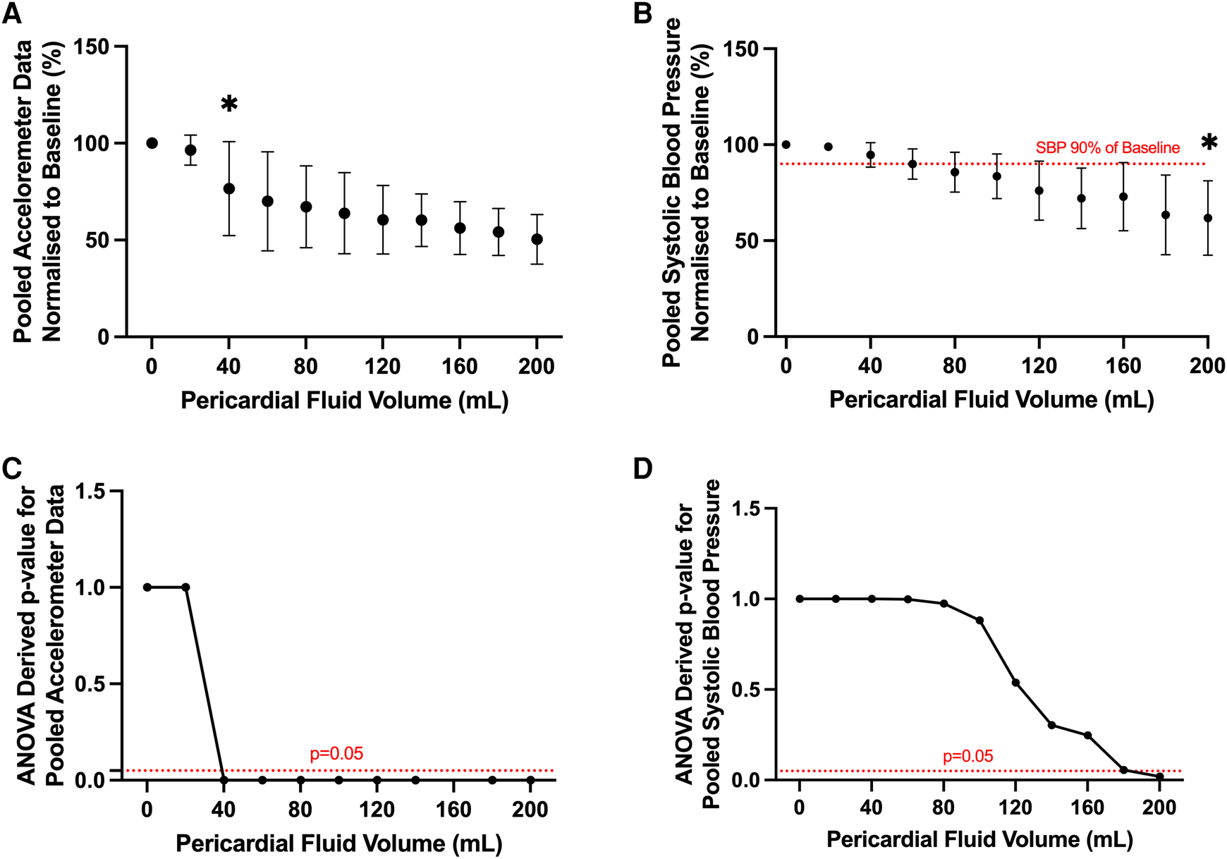 Pooled analysis of motion detection catheter and systolic blood pressure results from all ovine subjects. (A) Pooled accelerometer volumes normalized to baseline across different experimental conditions. Statistically significant change in acceleration volume from baseline noted after infusion of 40 ml of pericardial fluid. *p value < 0.05, ANOVA. (B) Pooled systolic blood pressure recordings normalized to baseline across different experimental conditions. Statistically significant change in systolic blood pressure from baseline noted after infusion of 200 ml of pericardial fluid. *p value < 0.05, ANOVA. Clinically significant change (90% of baseline, dotted red line) detected after infusion of 80 ml of pericardial fluid. (C) Line graph depicting ANOVA derived p values of pooled acceleration volume compared to baseline across different experimental conditions. Statistically significant change (p < 0.05) in experimental volume compared to baseline detected following infusion of 40 ml of pericardial fluid. (D) Line graph depicting ANOVA derived p values of pooled systolic blood pressure compared to baseline across different experimental conditions. Statistically significant change (p < 0.05) in experimental volume compared to baseline detected following infusion of 200 ml of pericardial fluid.