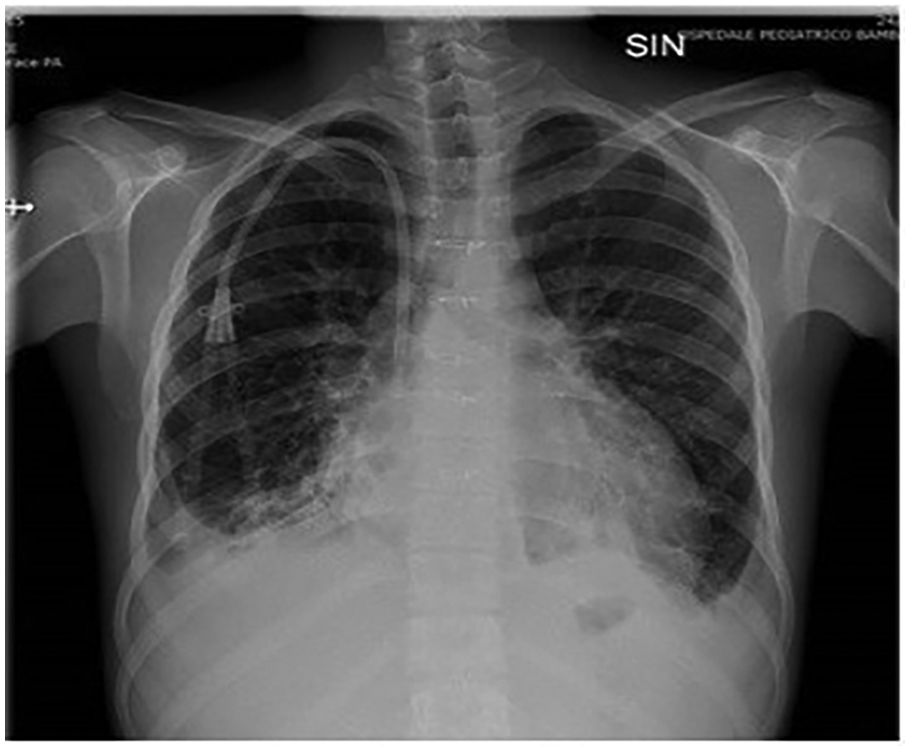 The patient was a 17-year-old boy who was previously diagnosed with a severe congenital heart disease. At 10 years of age, the patient was listed for heart transplantation and at 12 years underwent heart transplantation. At 16 years of age, the patient was diagnosed with stage 3B Hodgkin's lymphoma post-transplant lymphoproliferative disorder (HL-PTLD) associated with an Epstein–Barr virus (EBV) infection. It is an uncommon PTLD with an unclear prognosis; however, treatment with HL-specific chemotherapy is associated with improved overall survival and event-free survival. The patient received combination chemotherapy with brentuximab vedotin (an anti-CD30 monoclonal antibody) and doxorubicin, vinblastine, and dacarbazinein (BV–AVD). The doses of BV, doxorubicin, vinblastine, and dacarbazinein were 1.2 mg/kg, 25 mg/m2, 6 mg/m2, and 375 mg/m2 (once per day on days 1 and 15), respectively. During the treatment, the mycophenolate mofetile; course was interrupted. Positron Emission Tomography after 2 cycles of BV-AVD revealed a complete metabolic response; the patient received a total of 4 cycles that were well tolerated. No cardiac toxicity was observed during the treatment. At the end of the treatment, disease assessment confirmed a complete metabolic response, and EBV was not detected in the blood. However, 1 month after the last chemotherapy cycle, i.e., at 17 years of age, the patient was admitted to the intensive care unit with symptoms and hemodynamic signs of a cardiogenic shock. Three days prior to this, he had experienced a mild increase in the body temperature (37.5°C) along with decreased energy and poor appetite. Laboratory testing revealed a normal blood cell count with no increase in eosinophils and abnormal cells; furthermore, the C-reactive protein level was normal as well. Troponin I level (3,408.3 pg/ml; high-sensitivity troponin assay) and brain natriuretic peptide level (3,890.1 pg/ml) were clearly elevated, with the creatinine level, EBV CRP copy number, and everolimus level being 1.88 mg/dl, 23,793 copies/ml, and 5 μg/L, respectively. A 12-lead electrocardiogram revealed sinus tachycardia with widespread ST depression. A chest radiograph (Figure 1) revealed bilateral pleural effusion, while a 2D-echocardiogram revealed severe left ventricular dysfunction (ejection fraction: 20%). An altered diastolic function and moderate mitral regurgitation were noted, and a thickening of the myocardium that can be evocative of eosinophilic infiltration (Figure 2). The right ventricular function was also impaired (right ventricular fractional area change, 20%; tricuspid annular plane systolic excursion, 12 mm) with severe tricuspid regurgitation and elevated right ventricular pressure. Thin layers of pericardial effusion and moderate bilateral pleural effusion were also noted. Therapy for acute heart failure was initiated intravenously using inotropic drugs (milrinone, adrenaline, vasopressin, and levosimendan); their doses were determined using an internal protocol. The patient underwent cardiac catheterization, coronarography, and endomyocardial biopsy (EMB) of the right ventricle. Coronarography was negative for obstructive lesions, and no intravascular ultrasound was performed at this time; however, the most recent study revealed a Stanford II coronary artery vasculopathy. Owing to the rapidly worsening hemodynamic stability, arteriovenous extracorporeal membrane oxygenation (ECMO) was initiated. During ECMO, the clinical conditions were critical but more stable.