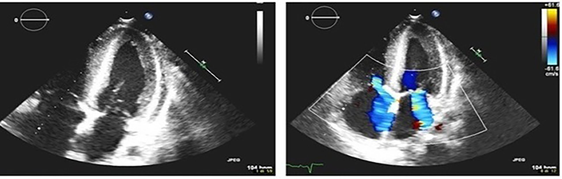 2D-echocardiogram shows moderate mitral regurgitation and thickening of the myocardium.