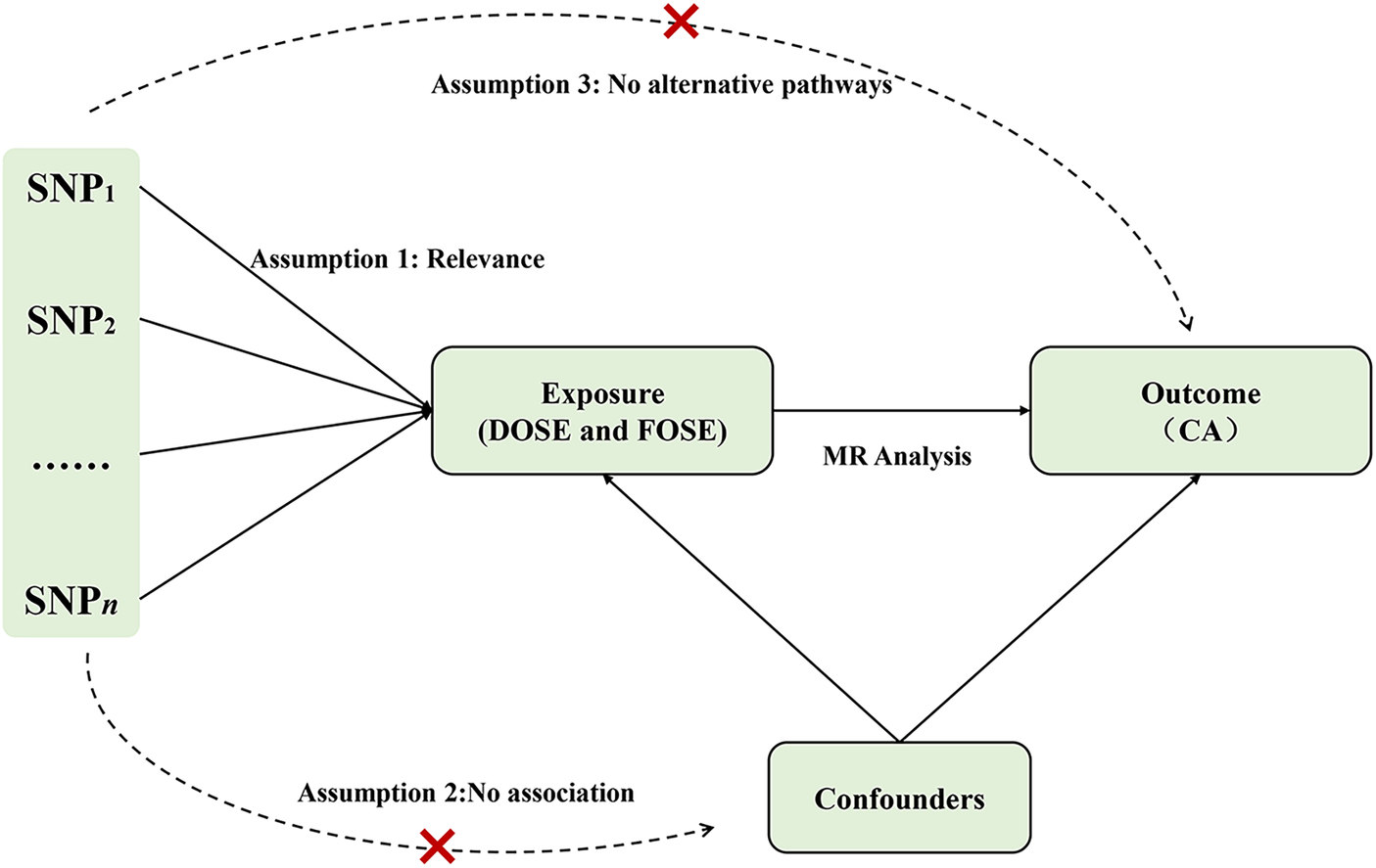 Assumptions of the Mendelian randomization (MR) analysis for exposure (DOSE and FOSE) and the risk of CA. The “×” means that genetic variants are not associated with confounders or cannot be directly involved in outcome but via the exposure pathway. SNP, single-nucleotide polymorphism; DOSE, duration of strenuous exercise; FOSE, frequency of strenuous exercise; CA, coronary atherosclerosis.