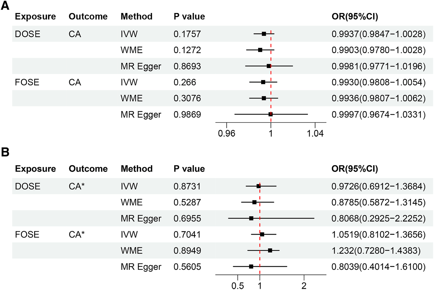 (A) Estimation of the causal relationship between DOSE/FOSE and CA using different MR methods. (B) Estimation of the causal relationship between DOSE/FOSE and CA* using different MR methods. DOSE, duration of strenuous exercise; FOSE, frequency of strenuous exercise; IVW, inverse variance weighted; WME, weighted median; OR, odds radio; CI, confidence interval; CA, coronary atherosclerosis. CA*, validation dataset for coronary atherosclerosis.