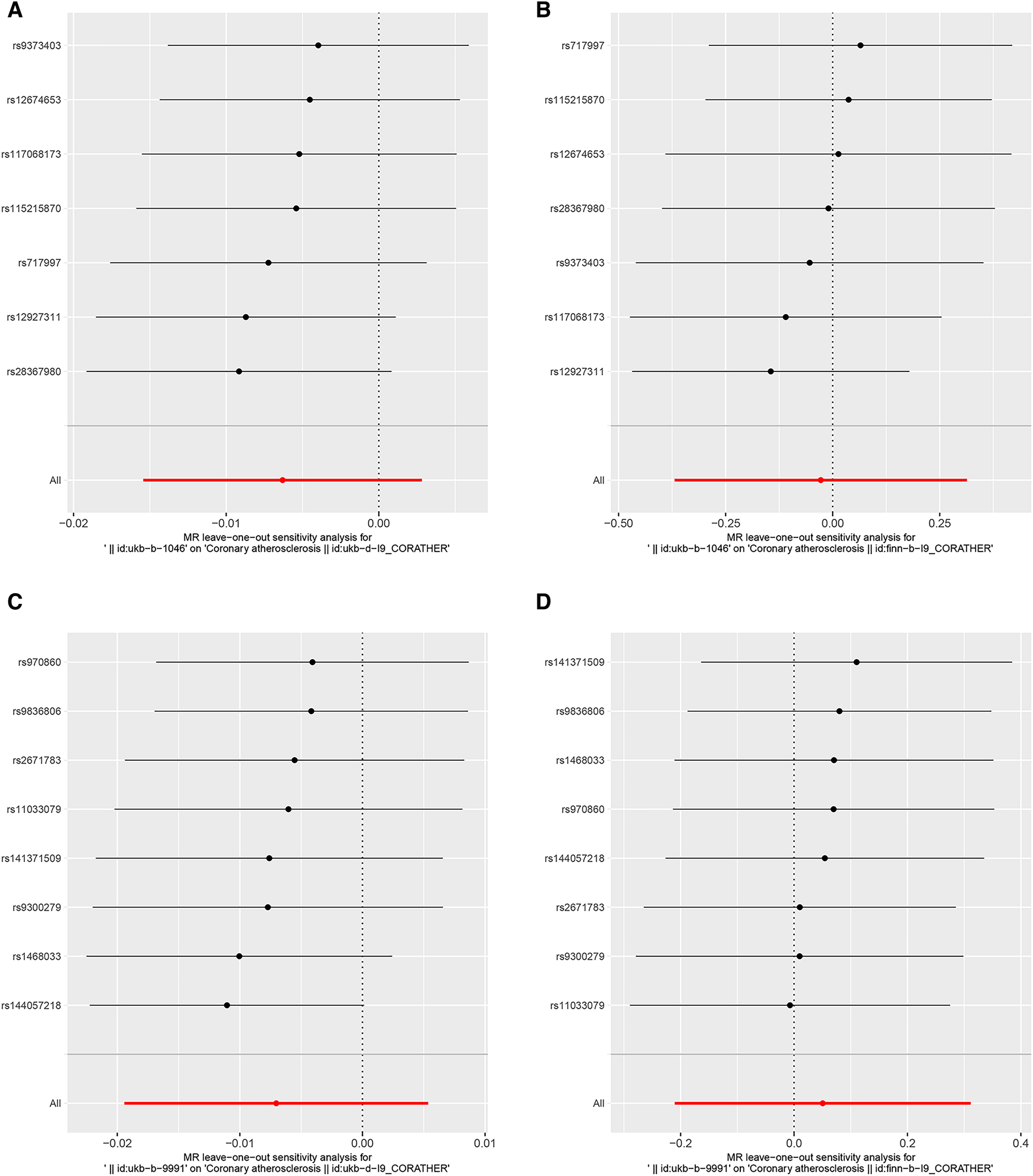 Leave-one-out plots to visualize the causal effects of DOSE/FOSE on CA/CA*. The x-axes represent associations of genetically predicted DOSE and FOSE with CA and CA*. The red line at the bottom represents 95% CI of the associations of genetically predicted DOSE and FOSE with CA and CA* with all SNPS added together. (A) Leave-one-out analysis for DOSE with CA. (B) Leave-one-out analysis for DOSE with CA*. (C) Leave-one-out analysis for FOSE with CA. (D) Leave-one-out analysis for FOSE with CA*. DOSE, duration of strenuous exercise; FOSE, frequency of strenuous exercise; CA, coronary atherosclerosis. CA*, validation dataset for coronary atherosclerosis.