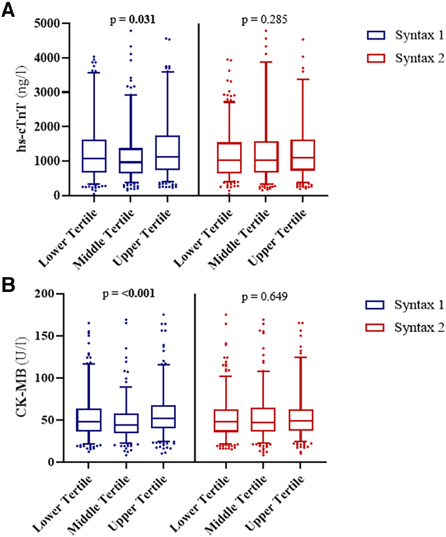 Categorical variables are presented as frequencies and proportions. Continuous variables are presented as medians and interquartile ranges. The cohort was divided into three tertiles according to SYNTAX Score I and SYNTAX Score II, respectively. Statistical analyses were performed for both scores separately. Kruskal–Wallis Test was used to analyse differences between the three tertiles. Levels of cardiac biomarkers upon surgery are presented in whisker blots with the 5–95 percentile. To assess the association between SYNTAX Scores and cardiac biomarker levels Spearman’s correlation and linear regressions were performed. In a sensitivity analyses elective cases were analysed only. P values < 0.05 were considered to indicate statistical significance. All statistical analyses were performed with SPSS Version 24 (IBM Corporation, Armonk, NY, USA) and GraphPad Prism version 9.0.