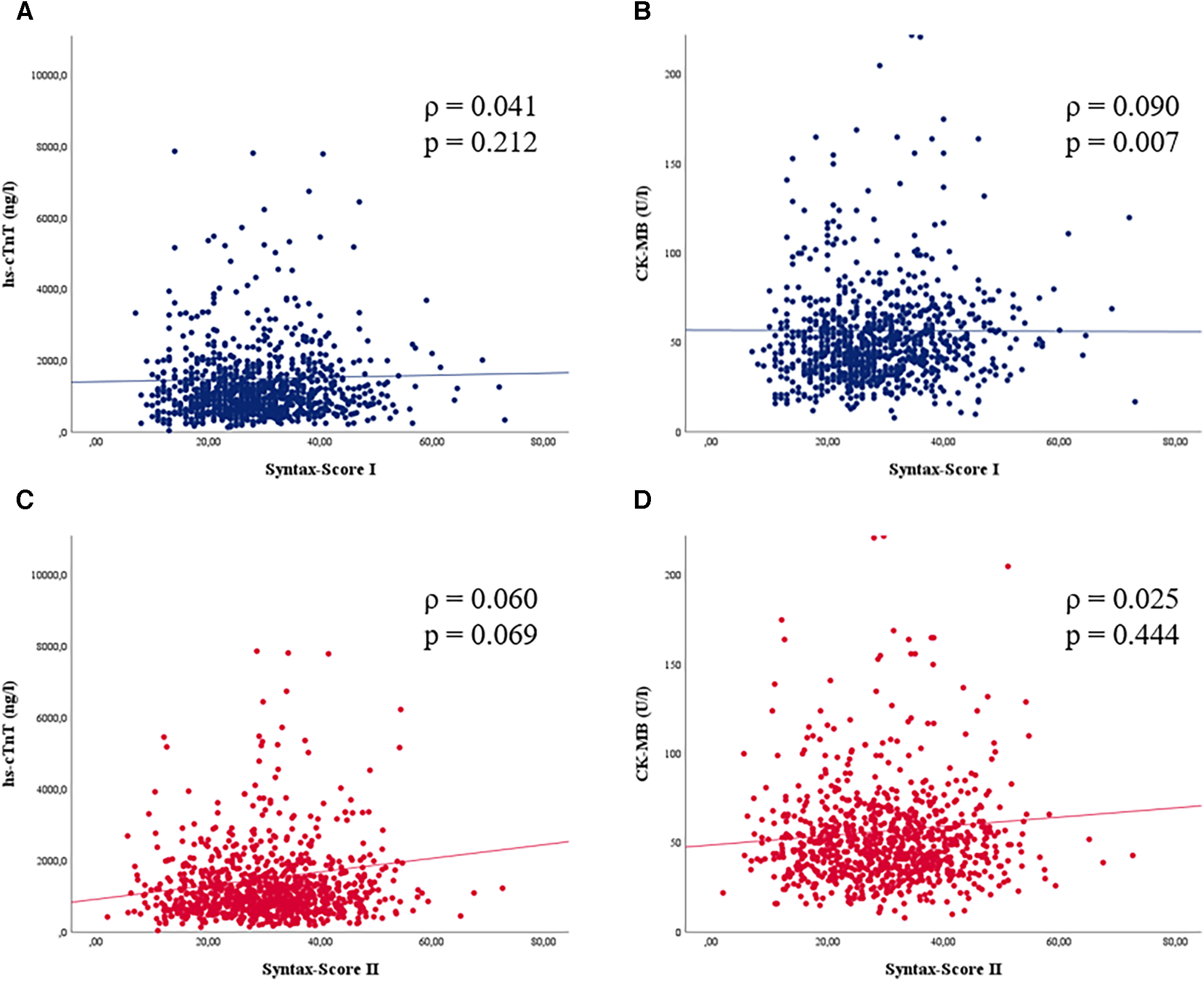 The SYNTAX Score II additionally reflects the patients' comorbidities. Interestingly, even in patients with a higher SYNTAX Score II, no differences were observed. Therefore, it seems unlikely that any comorbidities increase the release of cardiac biomarkers.