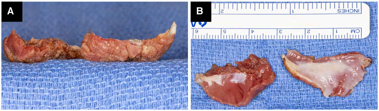 Operative photograph of two resected myectomy specimens showing the absence of charring and minimal electrocautery artifact on the raw surface (A). Both myectomy specimens are almost 3 cm × 2 cm × 0.7 cm in size, with the presence of scar tissue and almost complete absence of electrocautery artifact (B).