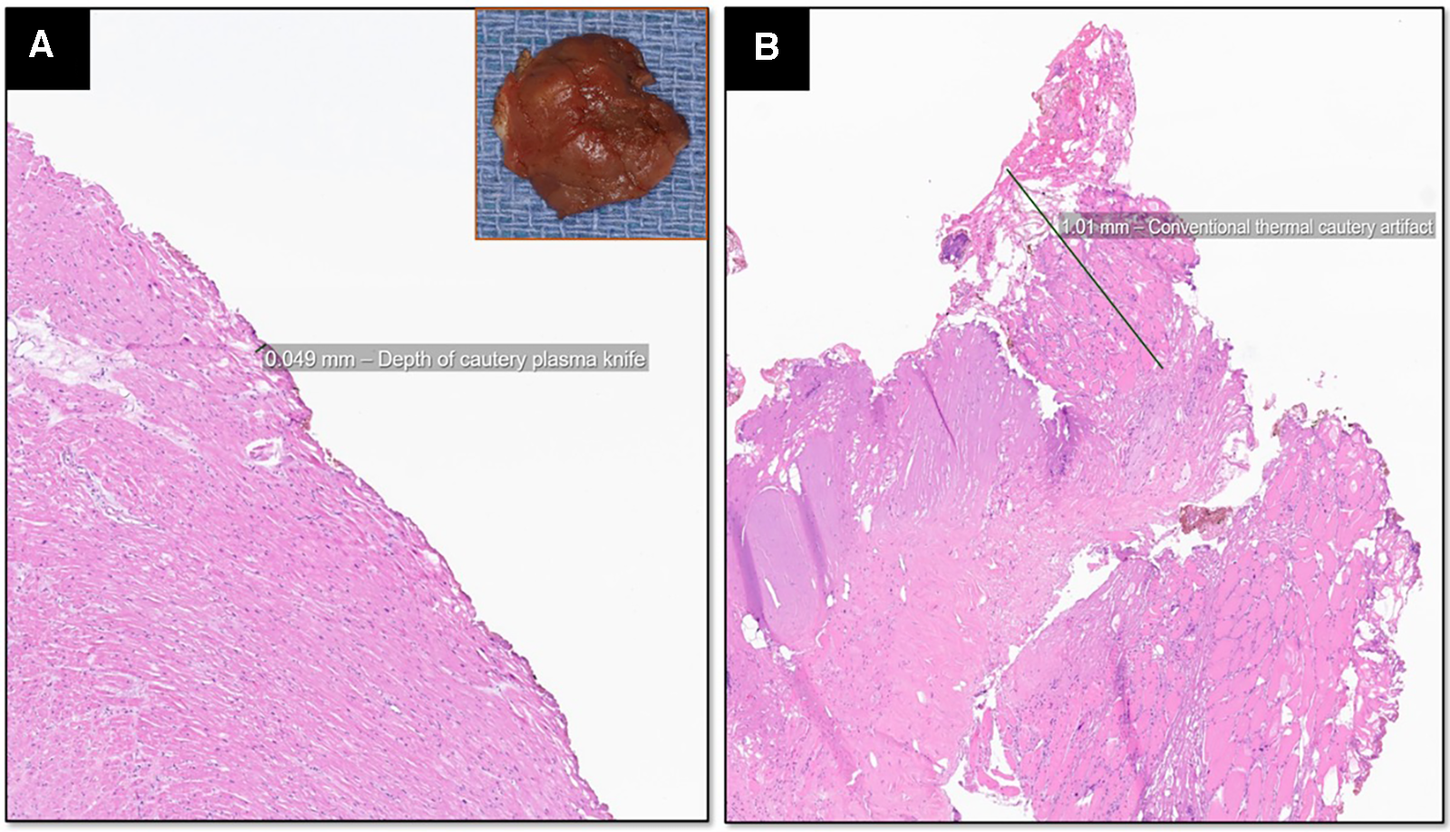 Hematoxylin and eosin, 20× magnification of the myomectomy specimen resected with the PlasmaBlade shows minimal superficial cautery artifact measuring less than 50 µm using digital pathologic measurements (A) and the absence of charring on the myectomy specimen (inset). The atrial appendage resected using conventional electrocautery shows 1,000 µm depth of thermal injury that extends from epicardial adipose tissue to cardiac muscle and endothelial vascular lining with loss of normal cellular architecture (B).