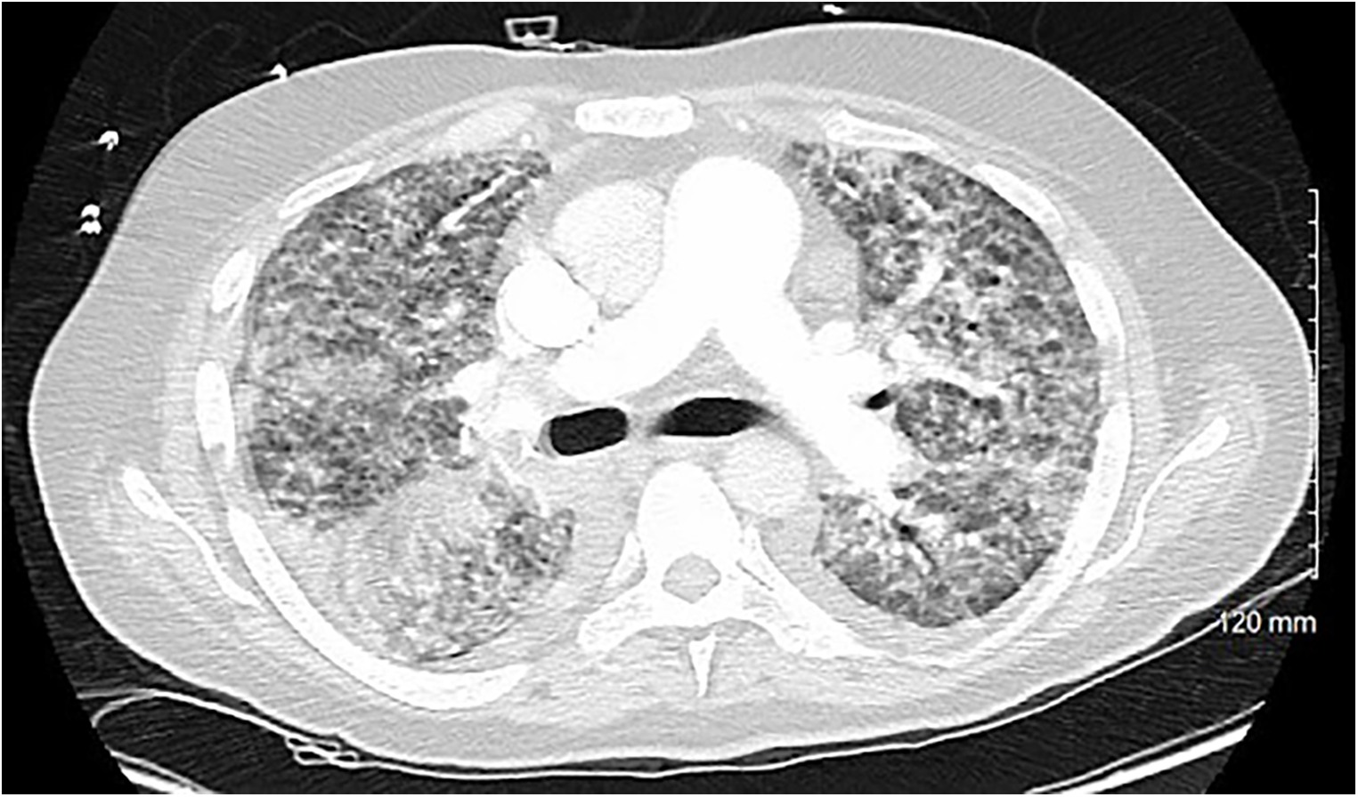 A 54-year-old otherwise healthy man presented to the emergency department with acute cardiogenic shock with respiratory failure (HR 124, SBP 120, RR 38, BNP 15,000) following a 10-day hospitalization 3 months’ earlier with COVID-19 pneumonia. The oxygen saturation rates were 68% on room air and 81% on 5 L of nasal cannula. He was also noted to have a lactic acid level elevated to 4. A computed tomography (CT) scan was performed, which showed diffuse pulmonary edema but ruled out pulmonary embolism (Figure 1). Due to respiratory decline, he was urgently intubated. A transthoracic echocardiogram was obtained, which showed severe mitral valve regurgitation with a flattening of the interventricular septum and a left ventricular ejection fraction of 70%. The mitral regurgitation was described as “severe” and the findings were consistent with endocarditis and papillary muscle rupture (Figure 2).