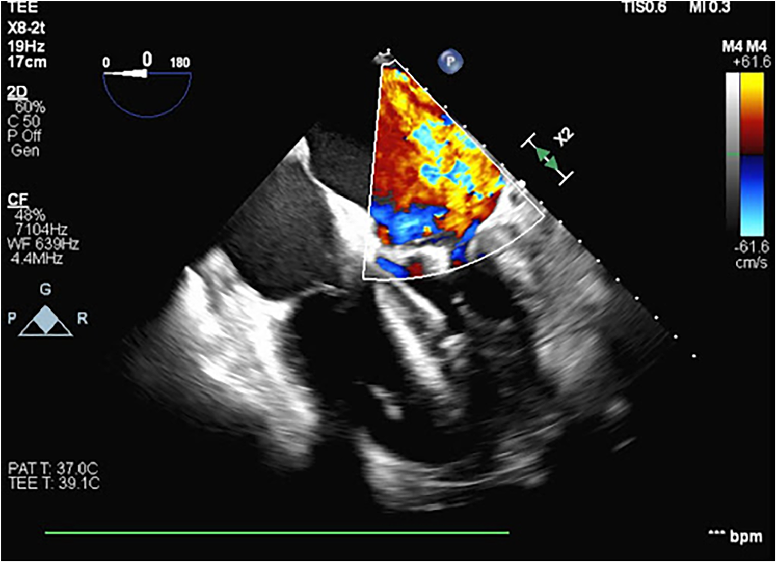 A transesophageal echocardiogram performed during VA ECMO cannulation and Impella placement showing severe mitral regurgitation with the central jet and a thickening of the mitral valve leaflets.