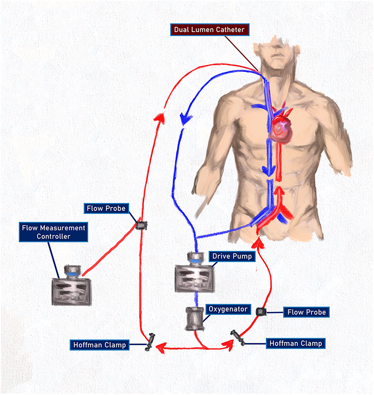 An ECMO configuration after combining VV and VA ECMO using a single pump and oxygenator with oxygenated blood delivered to both the pulmonary and the systemic circulations. The use of the Hoffman clamps allowed for titration of flow through both systems without the complications associated with two competing pumps. The flow measurement controller on the arterial side of the VV circuit was used only as a flow-measuring device and RPMs were not titrated.