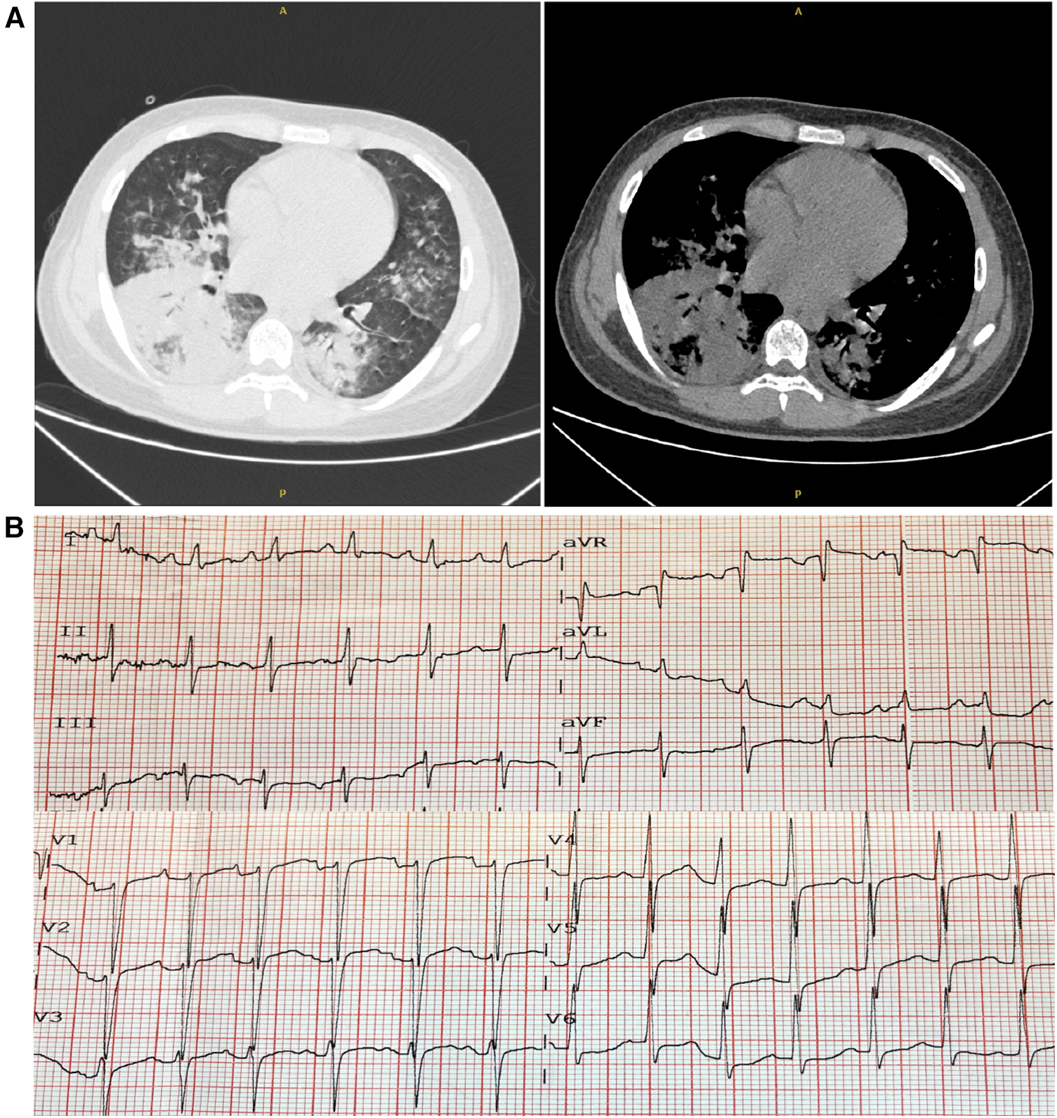 Chest computed tomography (CT) and electrocardiogram (ECG) on admission. (A) The chest CT scans revealed consolidation and patchy infiltrates within the right lower lobe and the left lower lobe. (B) The ECG showed sinus tachycardia accompanied by ST-T alterations.
