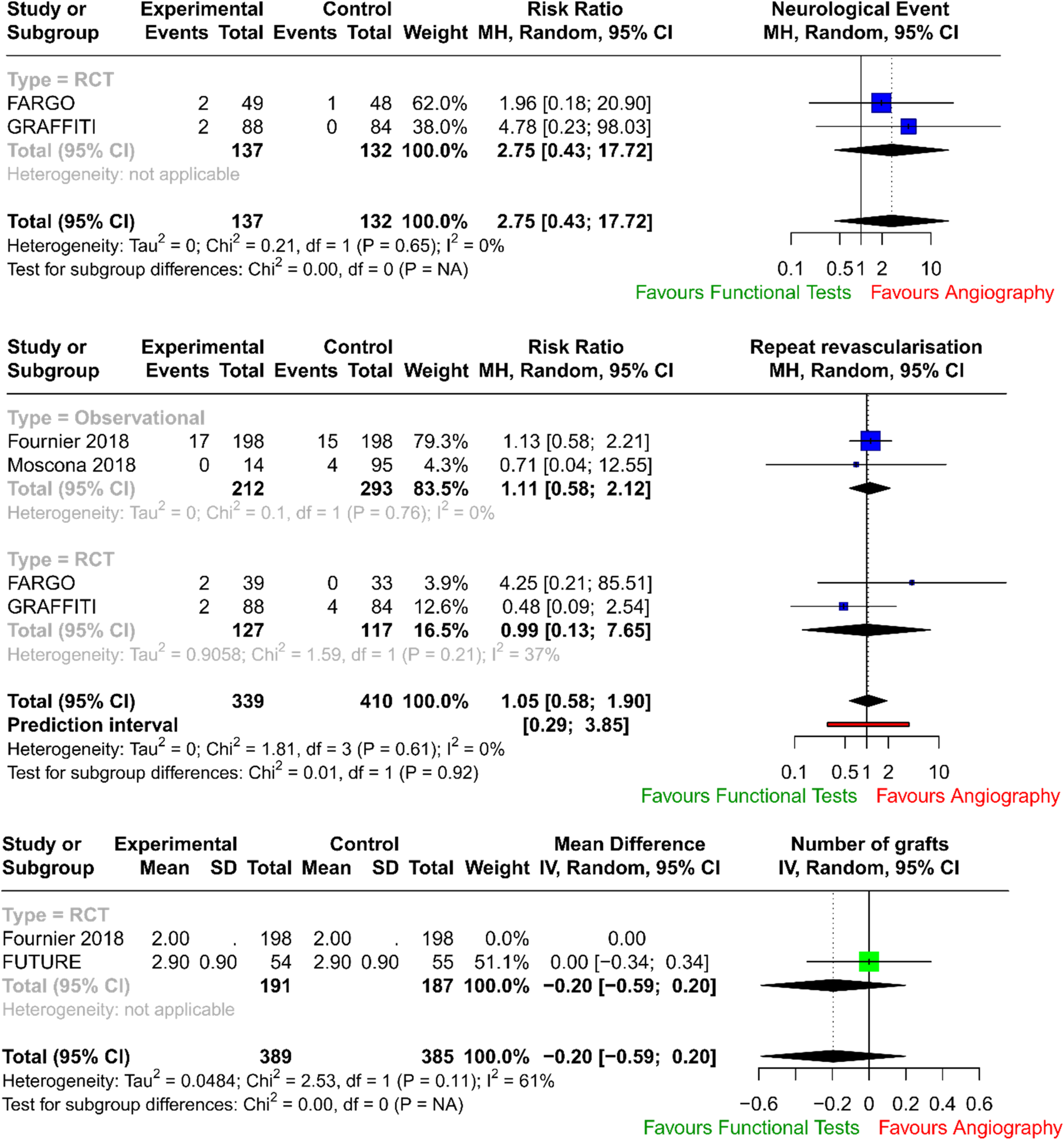 The forest plots with pooled estimates from random-effects meta-analyses are reported in Figure 2 (primary outcomes), Figure 3 (secondary outcomes) and in the Supplementary Material. In the primary analysis, when compared with conventional angiography, functional testing to guide CABG had no clear effect on mortality (four studies; RR 0.76; 95% CI: 0.47–1.24; I2 = 0%) and on myocardial injury (four studies; RR 0.59; 95% CI: 0.30–1.13; I2 = 0%). There was no clear effect on secondary outcomes such as postoperative neurological events (two trials; RR 2.75; 95% CI: 0.43–17.72; I2 = 0%), number of grafts (two trials; MD, −0.20; 95% CI: −0.59 to 0.20; I2 = 61%), and need for repeat unplanned revascularisation (four trials; RR 1.05; 95% CI: 0.58–1.90; I2 = 0%). There were no available data to assess the effect of preoperative functional testing on renal injury. The investigators from FARGO reported no difference among the study groups in terms of quality of life at 6 months after the surgical operation (data available for 86 patients, EuroQoL 5-level index score 0.90 ± 0.11 vs. 0.89 ± 0.12 for functional testing and angiogram, respectively).