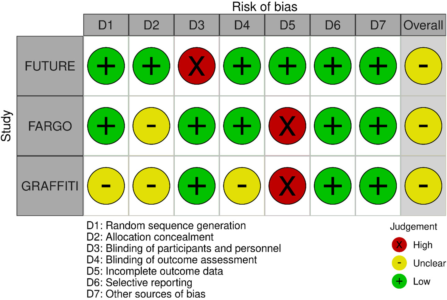 The quality of the retrieved evidence was poor (Figures 4 and 5). The most critical domain for the RCTs was the blinding of participants and personnel (FUTURE), and the incomplete outcome reporting due to loss of patients at follow-up (FARGO, GRAFFITI). Notwithstanding their intrinsic limitation due to lack of randomisation, observational studies were rated as of adequate quality according to the Newcastle–Ottawa scale (Supplementary Appendix S2).