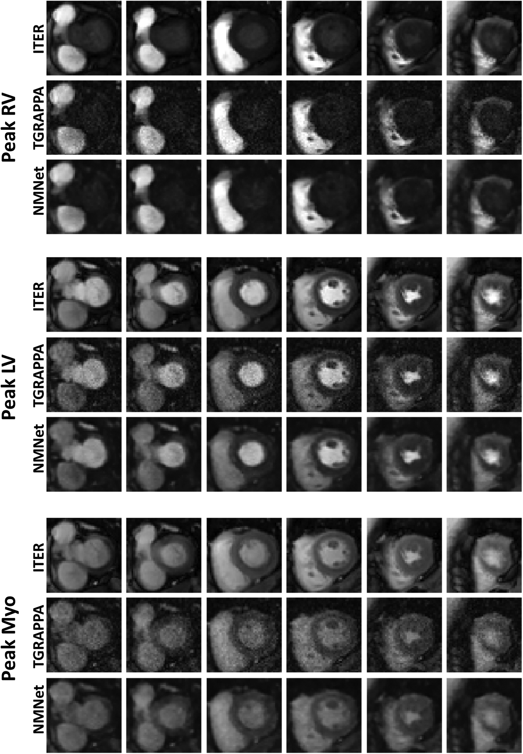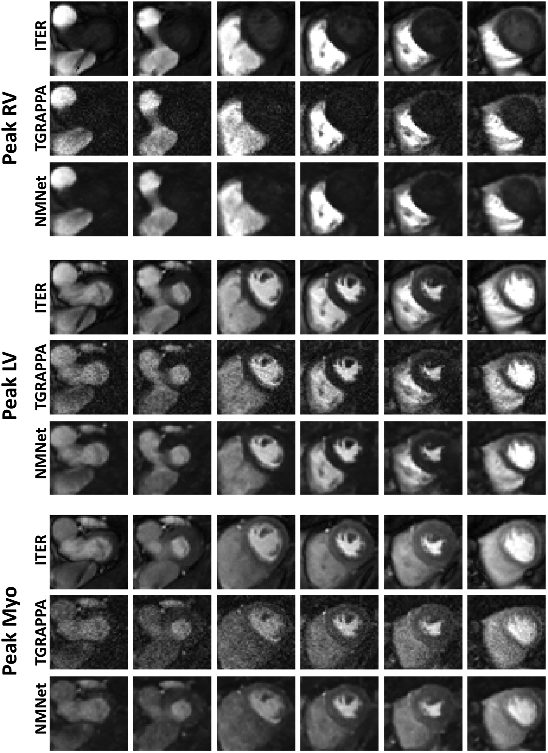 SMS perfusion images acquired in a 44 years old male patient. Images were reconstructed using ITER, TGRAPPA and NoiseMapNet. While high noise level can be observed in TGRAPPA images, image quality and SNR visually improved using the NoiseMapNet. Note the presence of artifacts using ITER (see the most basal slices) which are minimal in both TGRAPPA and NoiseMapNet.