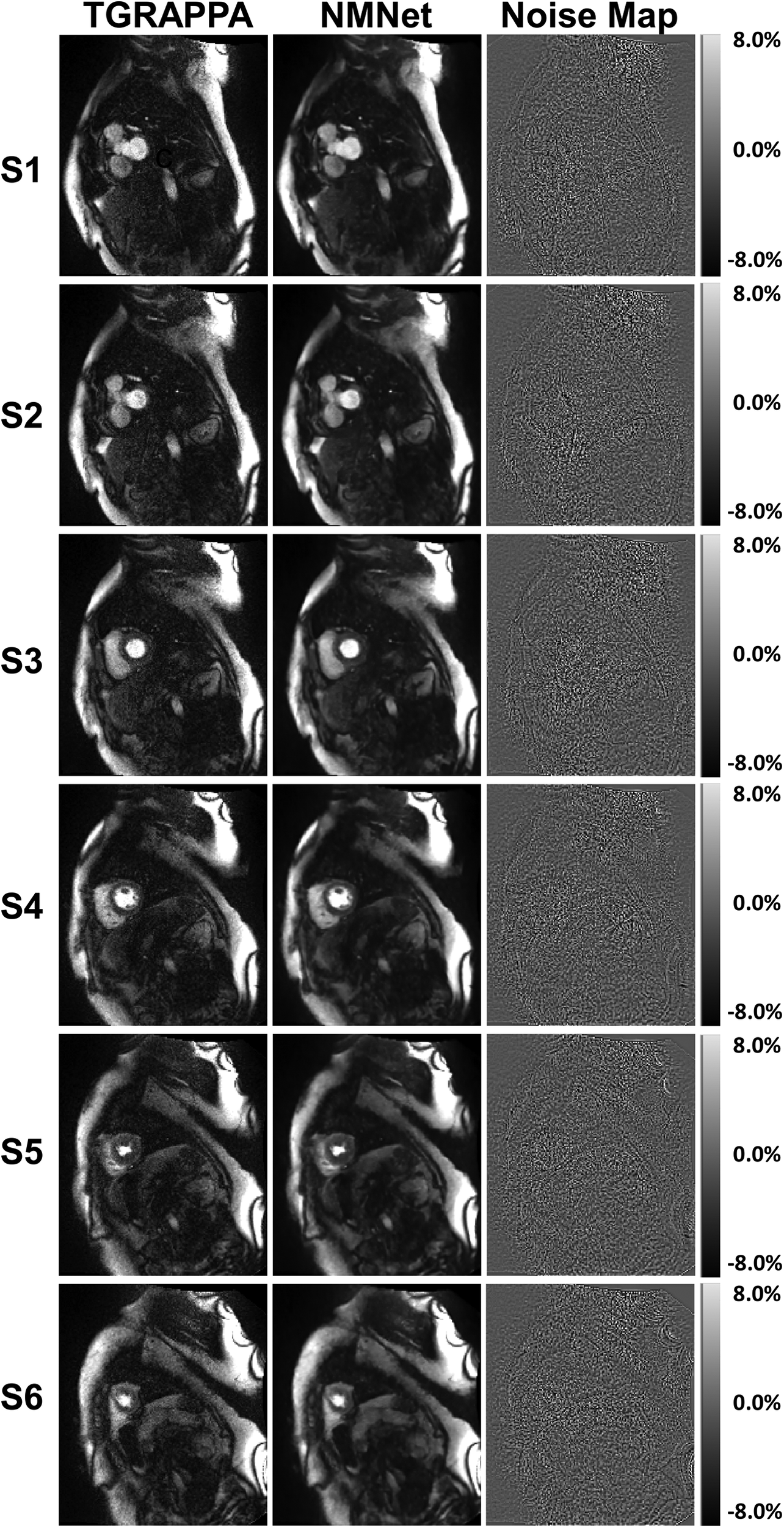 TGRAPPA images, NoiseMapNet (NMNet) images and predicted noise maps are shown for the patient shown in Figure 2 and all 6 SMS slices acquired at maximum signal enhancement in the left ventricular blood pool. Significant spatial noise variations are observed in the noise maps. NoiseMapNet provided consistent image denoising across the entire field of view, despite spatially varying noise levels.