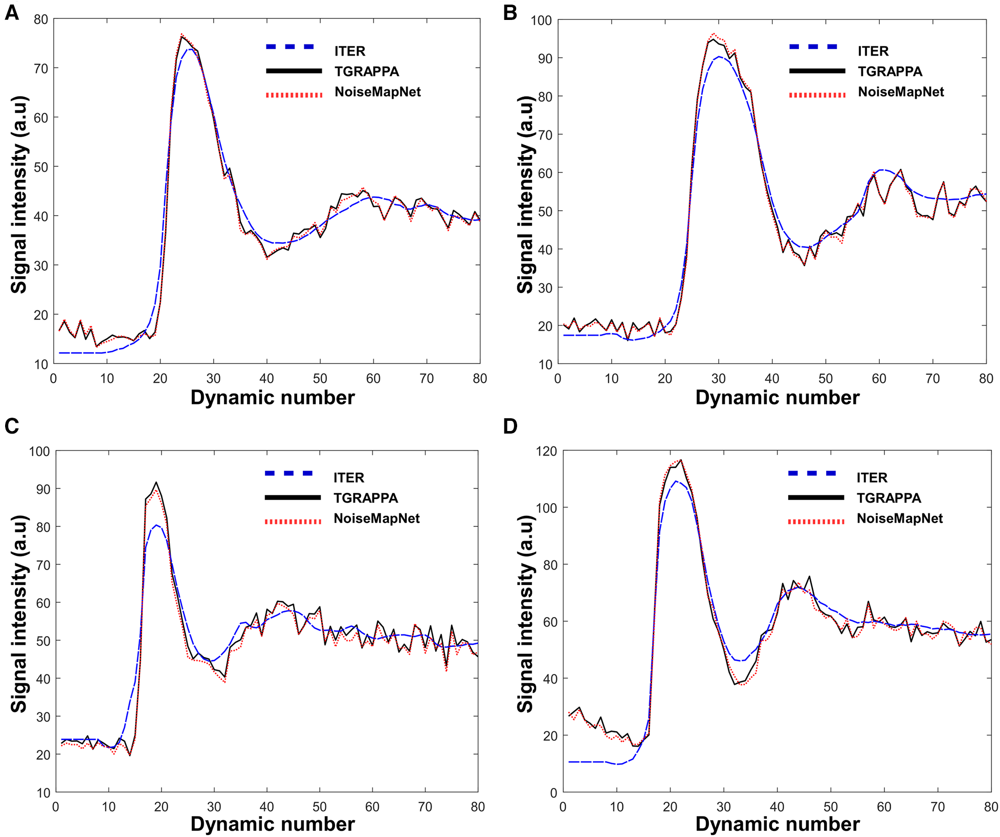 Figure 6 shows the temporal signal profiles measured in the LV blood pool for each reconstruction from four patients. ITER resulted in some alterations of the temporal profiles of the signal with respect to the reference TGRAPPA signal profiles. Specifically, temporal smoothing can be observed in ITER as earlier contrast uptake and delayed/reduced signal peak as expected from the temporal regularization employed in this reconstruction. Conversely, NoiseMapNet and TGRAPPA signal profiles appears similar, suggesting the absence of bias when using NoiseMapNet. This was confirmed over all patients where the NMSE over the first-pass of NoiseMapNet was lower compared to that of ITER for both myocardium (0.045 ± 0.021 vs. 0.172 ± 0.041, p < 0.001) and left ventricular blood pool (0.025 ± 0.014 vs. 0.069 ± 0.020, p < 0.001).