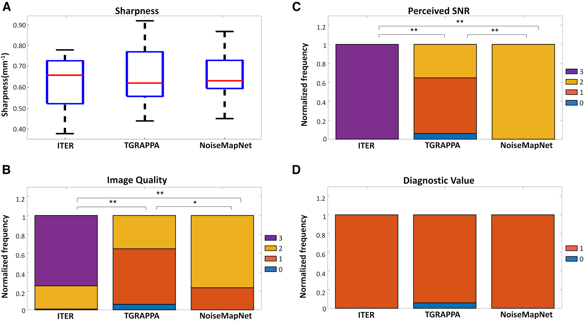 This study has some limitations. First, a relatively small number of patients were included in this study. Second, SNR was not quantified in this study as it is challenging to measure in ITER images due to the iterative reconstruction which inherently thresholds and reduces noise inhomogeneously across the field of view (54). This is consistent with prior studies using compressed sensing, which have avoided reporting absolute SNR measurements but instead reported perceived SNR as performed in this study (54). Third, TGRAPPA was used as a reference for the temporal signal analysis. Although TGRAPPA has low SNR, the analysis was restrained to the first-pass of the contrast agent, thereby discarding low SNR baselines images. Furthermore, the signal was measured for each dynamic over a large ROI further minimizing the impact of noise. TGRAPPA does not use any temporal regularization and is therefore not expected to alter the temporal signal profile. Therefore, potential bias related to the use of TGRAPPA as reference signal for this analysis should have been kept to the minimum. Finally, although NoiseMapNet was shown to provide important benefits in terms of image quality, SNR, signal fidelity and computation time, its impact on diagnostic accuracy was not demonstrated. Therefore, a diagnostic accuracy study in a larger CAD patient cohort is now warranted to compare these techniques.