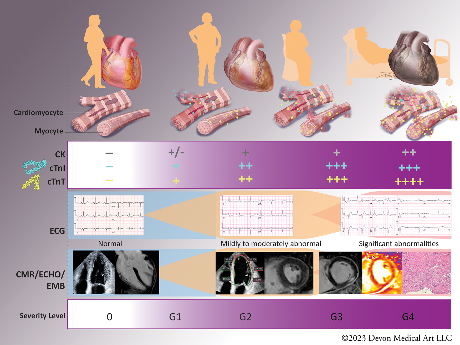 Biomarkers in diagnosis and severity of immune checkpoint inhibitor (ICI)-myocarditis. The diagnosis of ICI-myocarditis relies on clinical presentation, circulating biomarkers, cardiac imaging and endomyocardial biopsy in select cases. Mild elevations of cardiac troponins (cTns) have been described in asymptomatic patients without abnormalities in cardiac imaging (Grade 1, subclinical ICI-myocarditis), while patients with Grade 2 or mild ICI-myocarditis have abnormal cTns and some abnormalities on electrocardiogram (ECG), echocardiogram (ECHO), and/or cardiac magnetic resonance (CMR). Patients with moderate (Grade 3) or severe (Grade 4) ICI-myocarditis have clinical symptoms and often present with concomitant myositis reflected in increase in creatine kinase (CK) and cTnT. Severity of biomarker abnormalities has been shown to correlate with the adverse outcomes, however the exact cut-off values remain to be determined. “-”: values below the upper reference limit“; “+”: increments above the upper reference limit; CK, creatine kinase; hs-cTnI, high sensitivity cardiac troponin I; hs-cTnT, high sensitivity cardiac troponin T; ECG, electrocardiogram; ECHO, echocardiogram; CMR, cardiac magnetic resonance; EMB, endomyocardial biopsy; G1-4, Grade1-4.