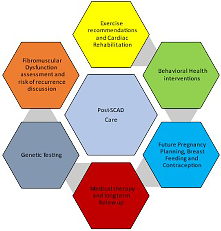 In this section, we enlist a stepwise format to address and recognize some of the patient facing challenges in the management of post-SCAD care. These concerns focus on rehabilitation of patients and return to functional lives. (Central Illustration, Table 2).