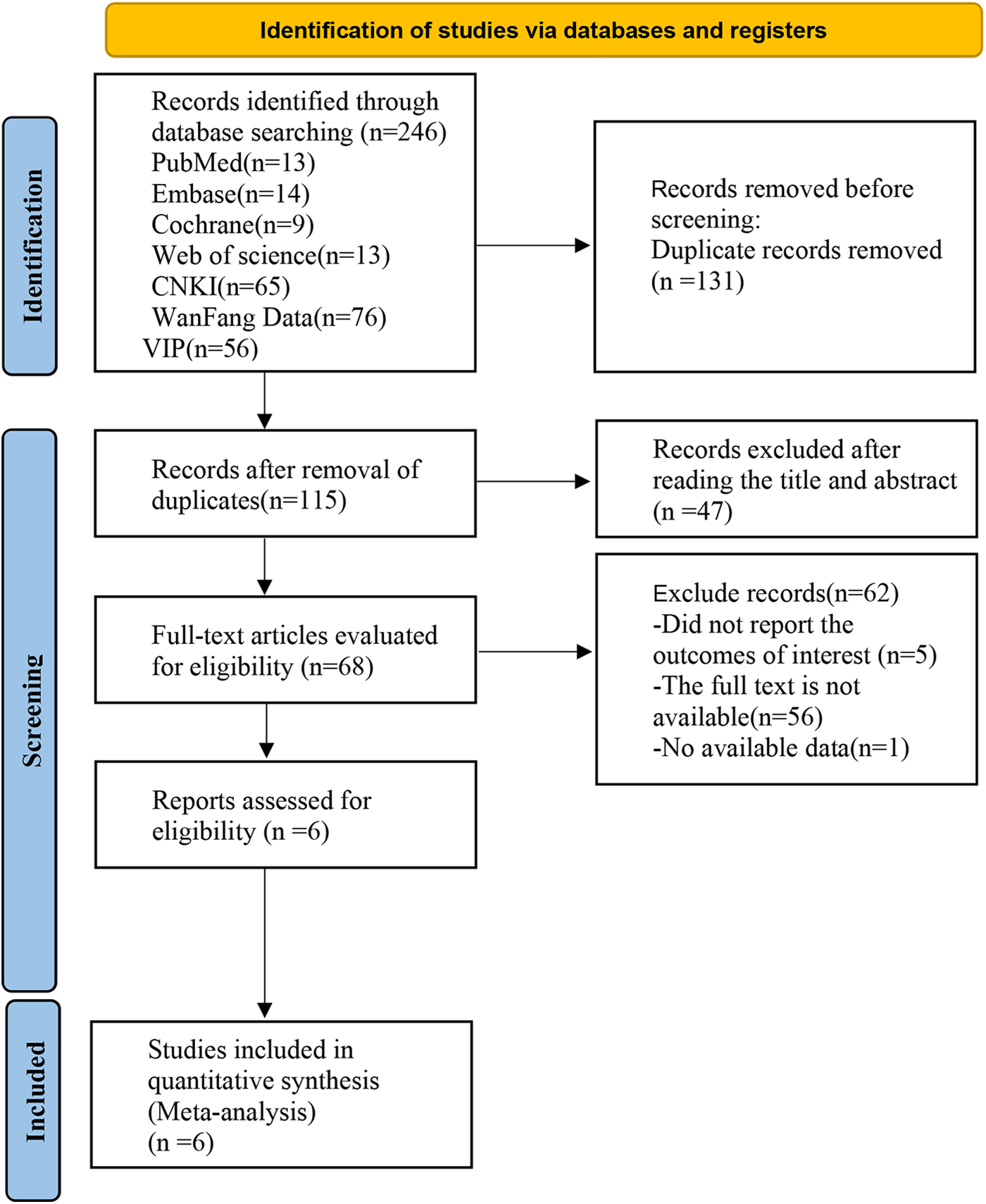 A total of 246 potentially relevant articles were identified through database searches: PubMed (n = 13), EMbase (n = 14), the Cochrane Library (n = 9), Web of Science (n = 13), CNKI (n = 65), WanFang Data (n = 76), and VIP (n = 56). After removing duplicate publications, 115 papers remained. Following the initial screening of titles and abstracts, 68 papers were deemed potentially eligible. However, a comprehensive review of the full texts revealed that 62 papers did not meet the predefined inclusion and exclusion criteria. Consequently, six RCTs (34–39), involving 767 patients, were ultimately incorporated in the analysis. The detailed screening process is illustrated in Figure 1.