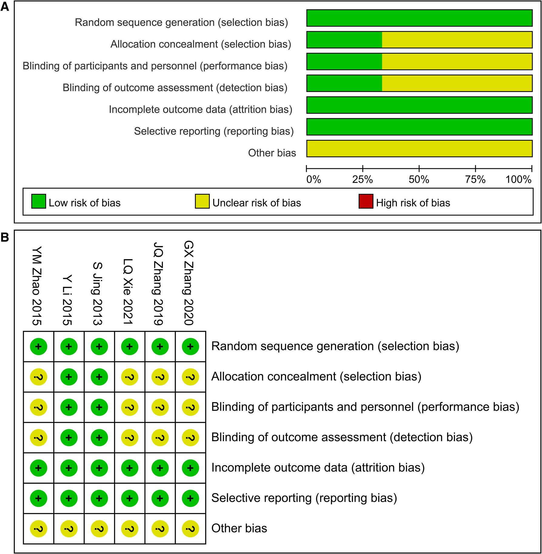 The analysis included six studies, three conducted in English and three in Chinese, all originating from China and involving a total of 767 participants, comprising 387 men and 380 women. All studies reported randomization, with two studies employing double-blind methods and one utilizing single-blind methods. Two studies compared Allisartan Isoproxil with placebo, while four studies compared it with conventional antihypertensive therapy alone. The dosage of Allisartan Isoproxil was consistent across five studies, administered at 240 mg once daily, with one study employing an 80 mg daily dose. Treatment duration ranged from 30 days to 6 months. Essential study characteristics are summarized in Table 1. Bias risk assessment was conducted using the Cochrane Collaboration's risk of bias tool, with outcomes depicted in Figures 2A,B.