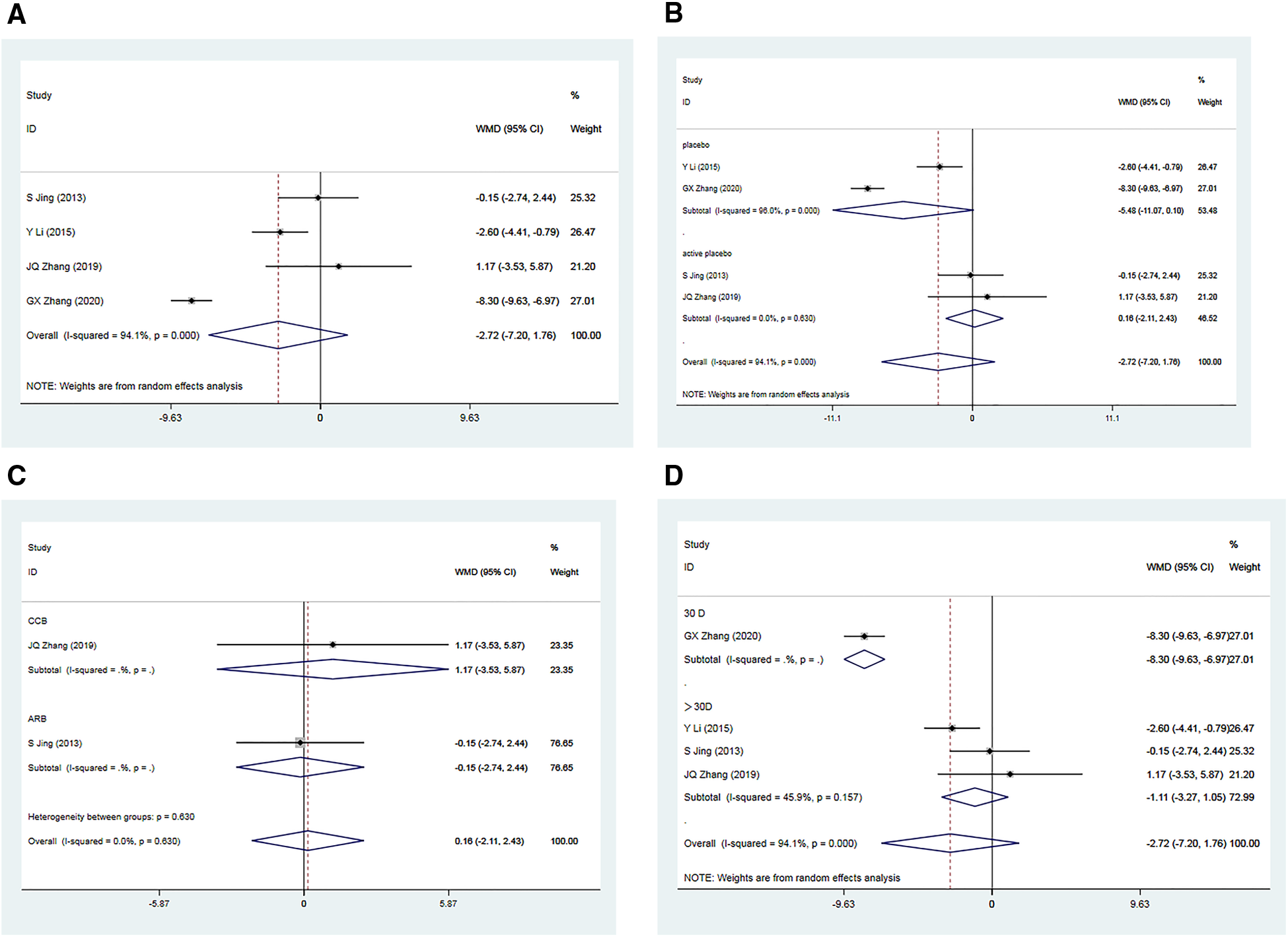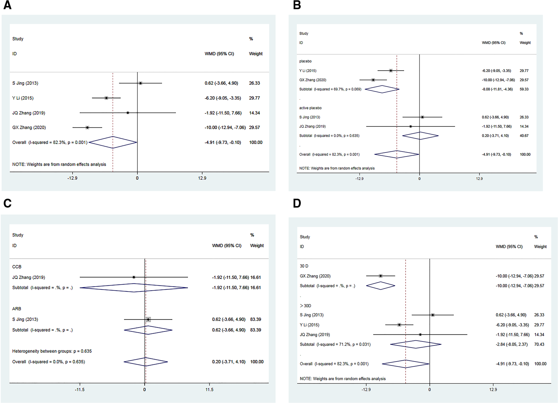 Forest plot for the meta-analysis of SBP. (A) Allisartan Isoproxil vs. non-Allisartan Isoproxil, (B) placebos vs. active placebos, (C) control group received CCB vs. control group received ARB, (D) 30 days follow-up vs. > exceeding 30 days follow-up.