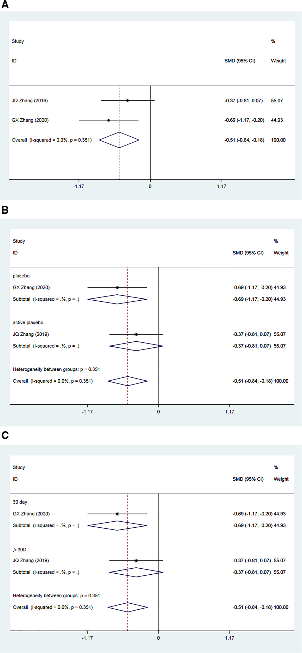 Forest plot for the meta-analysis of baPWV. (A) Allisartan Isoproxil vs. non-Allisartan Isoproxil, (B) placebos vs. active placebos, (C) 30 days follow-up vs. > exceeding 30 days follow-up.