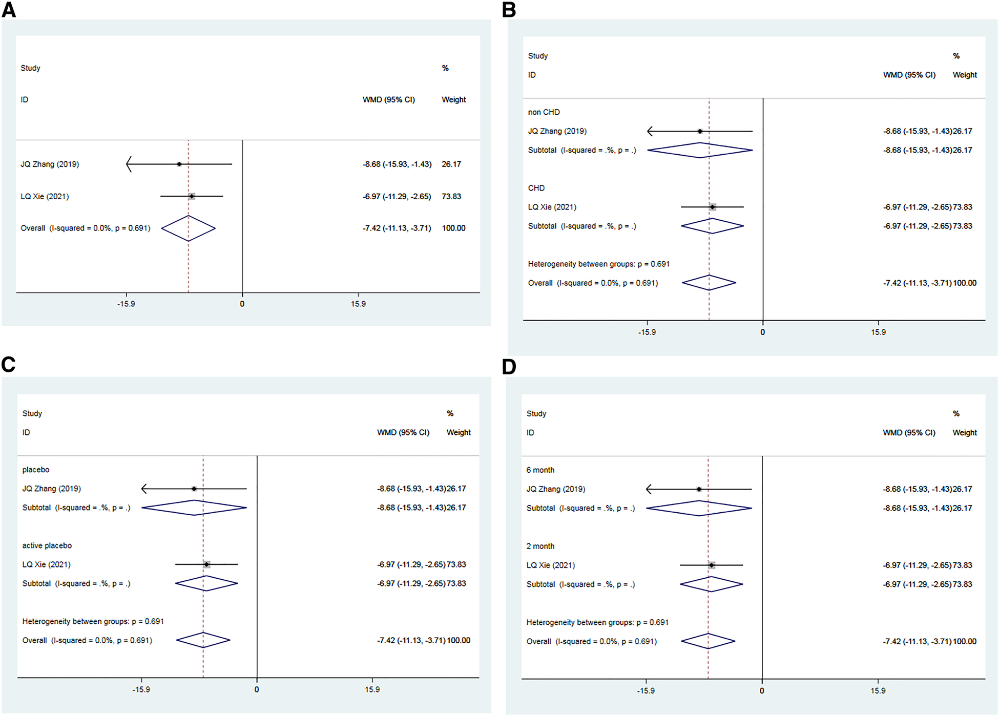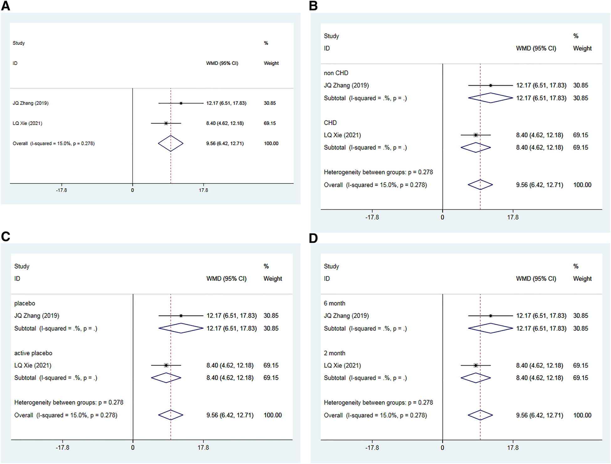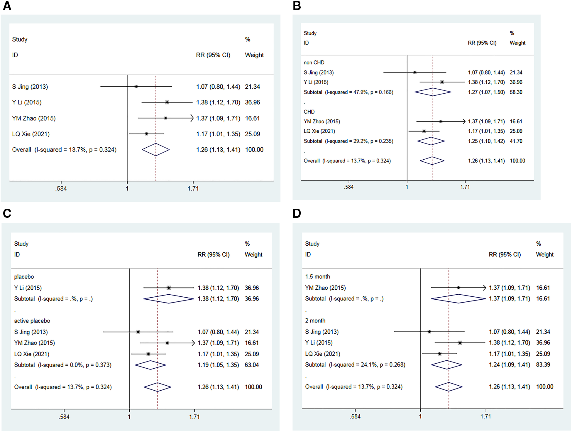 Forest plot for the meta-analysis of NO. (A) Allisartan Isoproxil vs. non-Allisartan Isoproxil, (B) hypertension with CHD vs. hypertension, (C) placebos vs. active placebos, (D) 6-month follow-up vs. 2-month follow-up.
