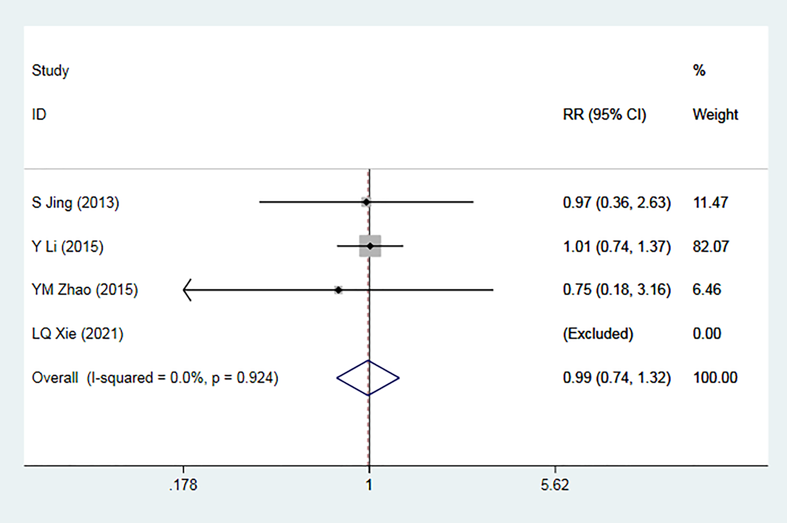 A comprehensive analysis was conducted, incorporating data from four RCTs (36–39) involving 619 patients. Among these studies, one reported no significant AE in either group, while three studies reported occurrences of AE. Importantly, none of the reported adverse events were fatal. Heterogeneity testing revealed low inter-study heterogeneity (I2 = 13.7%, p = 0.924). The meta-analysis outcomes indicated no statistically significant difference in the incidence of adverse events between the experimental and control groups [RR = 0.99, 95% CI (0.74, 1.32), p = 0.928] (Figure 9).