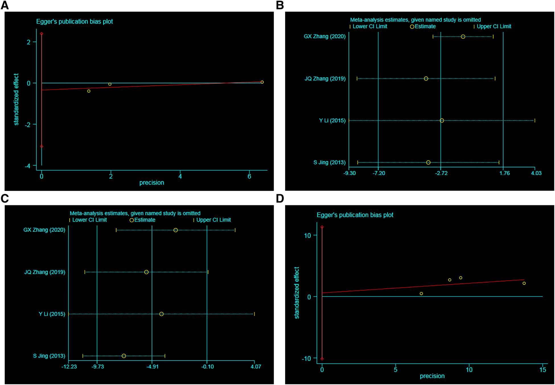 Statistical analysis was performed using Stata 15.1 software. Continuous variables were analyzed using either the weighted mean difference (WMD) or the standardized mean difference (SMD). Binary categorical variables were analyzed using relative risk (RR) as the statistical measure. Each effect size was accompanied by its 95% confidence interval (95% CI). Heterogeneity among the included studies was evaluated using the I2 statistic. For studies with low statistical heterogeneity (I2 ≤ 50%, p > 0.10), a fixed-effect model was used for the meta-analysis. In cases of significant heterogeneity, further investigation was conducted, and a random-effects model was employed to account for clinical heterogeneity. The significance level for meta-analysis tests was set at α = 0.05. Subgroup analyses or sensitivity analyses were performed to address clinical heterogeneity, and Egger's test was used to determine publication bias.