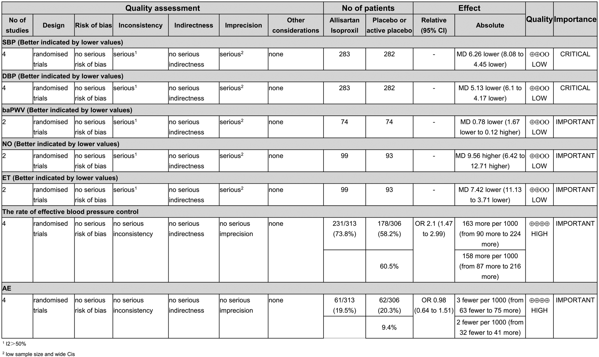 | YM Zhao | 2015 | 45 | 45 | 45/45 | CHD | - | - | Allisartan Isoproxil: 80 mg once daily | Irbesartan:150 mg once daily | A6; A7; | 6 Weeks |