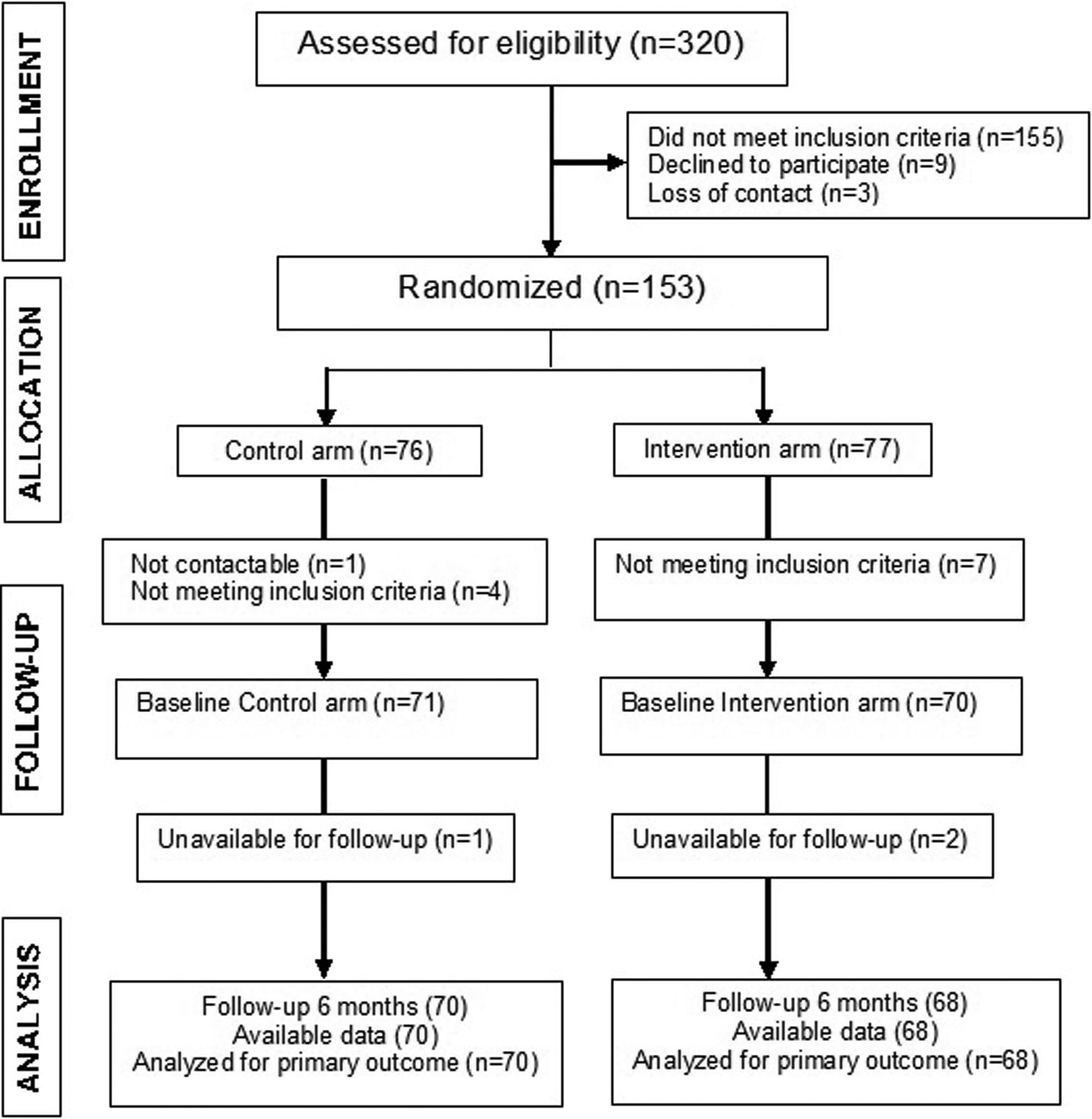 We screened 320 candidates for eligibility (Figure 1). Eligible individuals had a blood pressure of at least 140/90 mmHg registered in the electronic health records during the previous 12 months and also had a blood pressure of this level or higher during the initial consultation. One patient in the control group was lost before the baseline visit. We randomly allocated 76 patients to the control group and 77 to the intervention group, four patients in the control group and seven in the intervention group was excluded after randomization because of failure to meet the inclusion criteria.