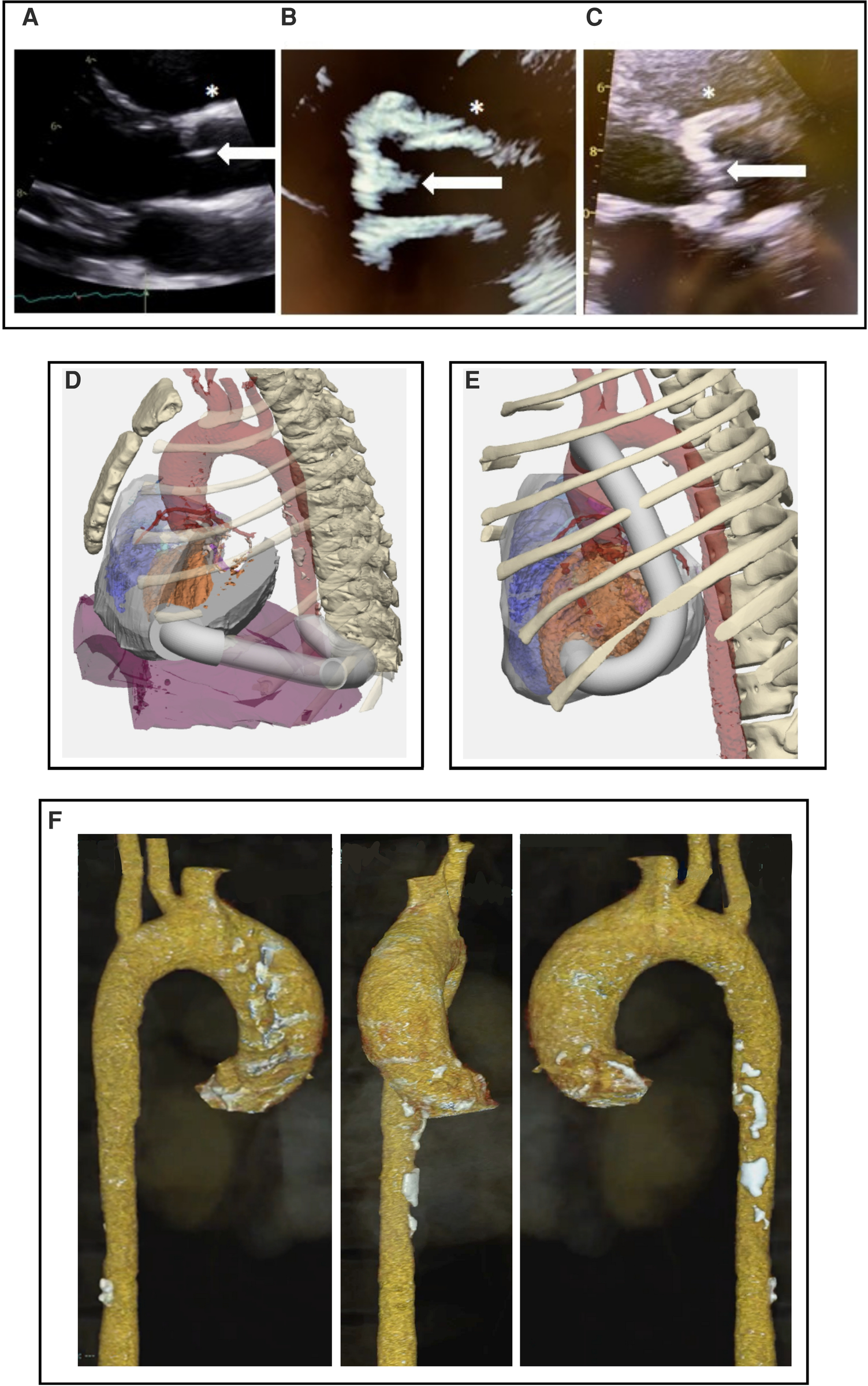 (A–C) Parasternal long axis echocardiographic view at the level of the aortic valve. (A) 19 y.o healthy control. (B) 22 y.o with HGPS and advanced aortic stenosis. (C) 72 y.o. with calcific aortic stenosis, demonstating calcific appearance in both aging and HGPS which is unlike the congential aortic stenosis seen in children. Note bright, diffusely thickened aortic valve (white arrows) and aortic wall (*) in (B) and (C) compared to (A). (D,E) 3-dimensional CT with AAC modeling performed prior to surgical intervention for cases #3 and #4. Design with conduit (white) origin at cardiac apex and insertion into (D) descending aorta and (E) ascending aorta. Orange is left ventricle; red is aorta. (F) CT 3D reconstruction of case #3 demonstrating calcification throughout the aortic arch and ascending aorta.