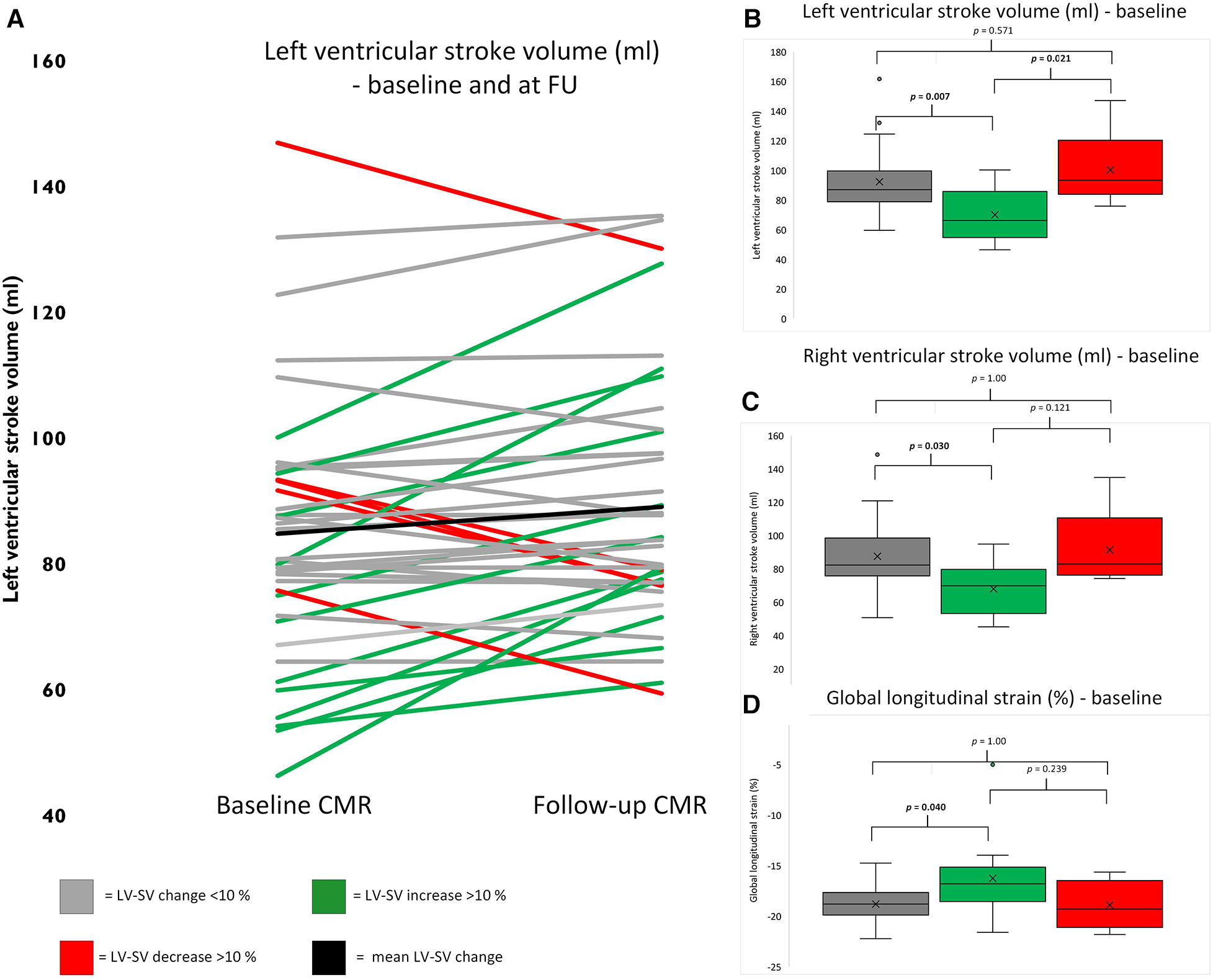 Trajectories for individual patients based on left ventricular stroke volume changes. (A) represents trajectories for LV-SV for each individual patient between baseline and follow-up scan. (B) depicts baseline values for left ventricular stroke volume, (C) for right ventricular strain, and (D) for global longitudinal strain. The boxplots represent the median (solid inside the box), interquartile range (box), and 1.5 × interquartile range (whiskers). Every value below or above 1.5 × interquartile range is marked as an outlier. Black, mean change; gray, change <10%; red, decrease >10%; and green, increase >10%.