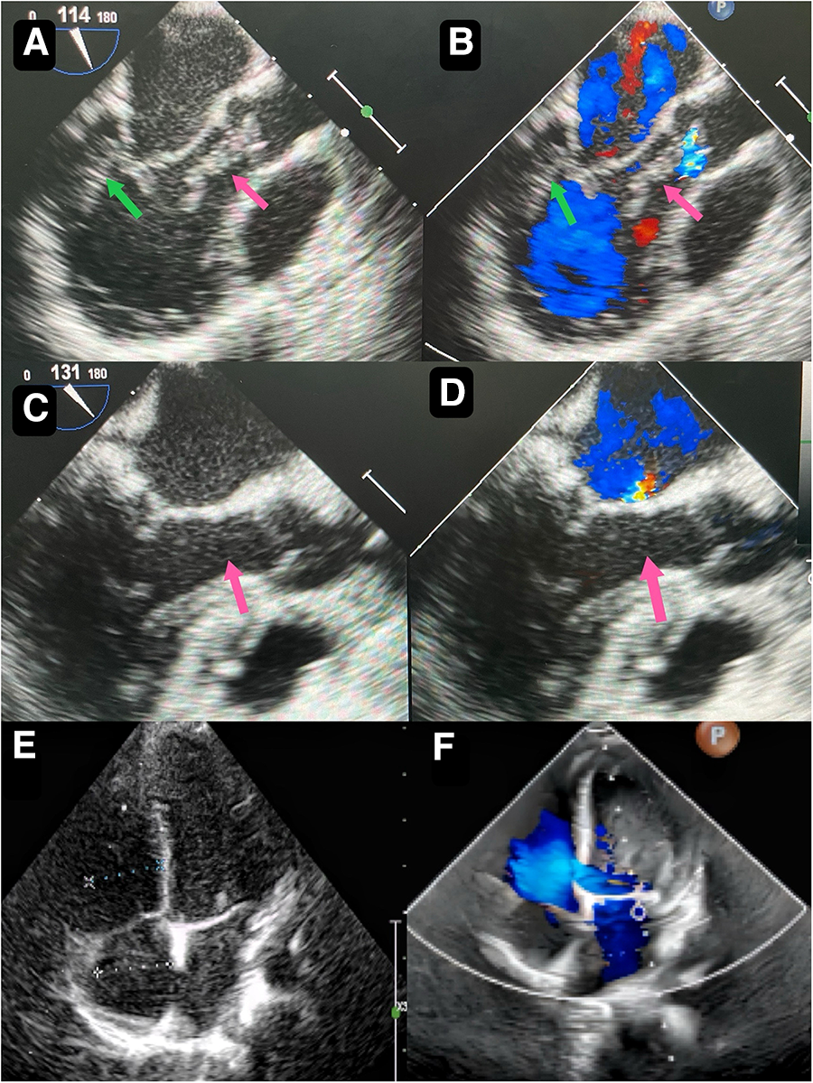 Preoperative transthoracic echocardiography reveals a slightly hyperechoic, approximately 32 mm by 16 mm mass in the posterior wall of the left ventricle (A) echogenic “string of beads” is observed wiggling in the left ventricular outflow tract, with one end connected to the posterior part of the left ventricle and the other end appearing to be connected to the left coronary sinus of the aorta (B) postoperative transesophageal echocardiogram shows complete removal of the mass (C) postoperative transesophageal echocardiogram shows competent mitral valve (D) preoperative transthoracic echocardiogram shows competent mitral valve (E) postoperative transthoracic echocardiogram mitral valve shows trivial regurgitation (F).