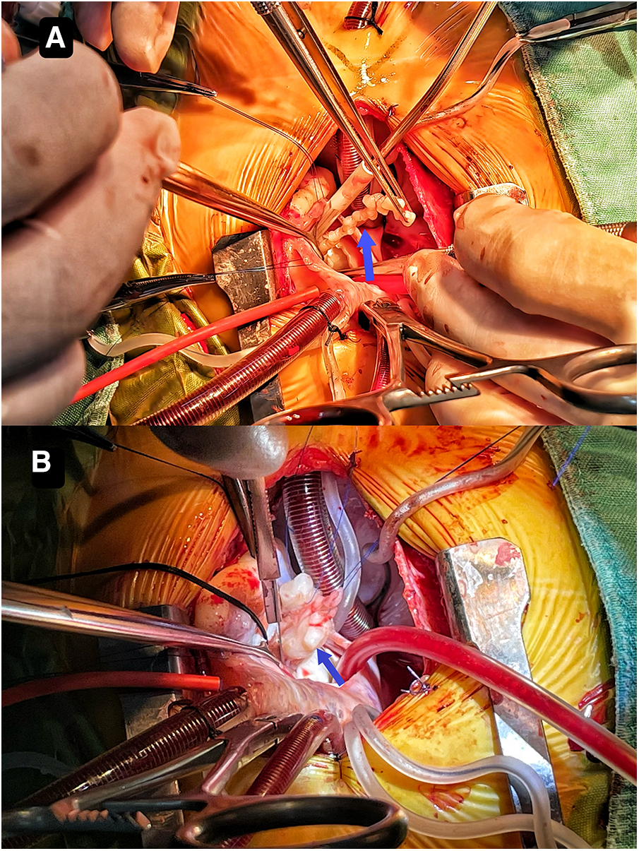 A 2-year-and-8-month-old toddler was admitted to the hospital for evaluation of chronic constipation attributed to long-standing low-fiber diet and poor therapeutic effect of prolonged lactulose use on softening stools. A heart murmur was noted on physical examination. The child had no relevant medical history or signs of infection, trauma, cold, or any other predisposing factors. Preoperative transthoracic echocardiography revealed a hyperechoic, approximately 32 mm by 16 mm mass in the posterior wall of the left ventricle (Figure 1A). In addition, an echogenic “string of beads” was observed wiggling in the left ventricular outflow tract, with one end connected to the posterior part of the left ventricle and the other end appearing to be connected to the left coronary sinus of the aorta (Figure 1B). The sizes of the four chambers were considered normal, and the ejection fraction was 63%. Interestingly, this child showed no clinical symptoms and results of coagulation assays, neutrophil, C-reactive protein, complete antinuclear antibody, antineutrophil cytoplasmic antibodies, and antistreptolysin O titer tests were all insignificant. A diagnosis of tumor, thrombus or vegetation was yet to be made.