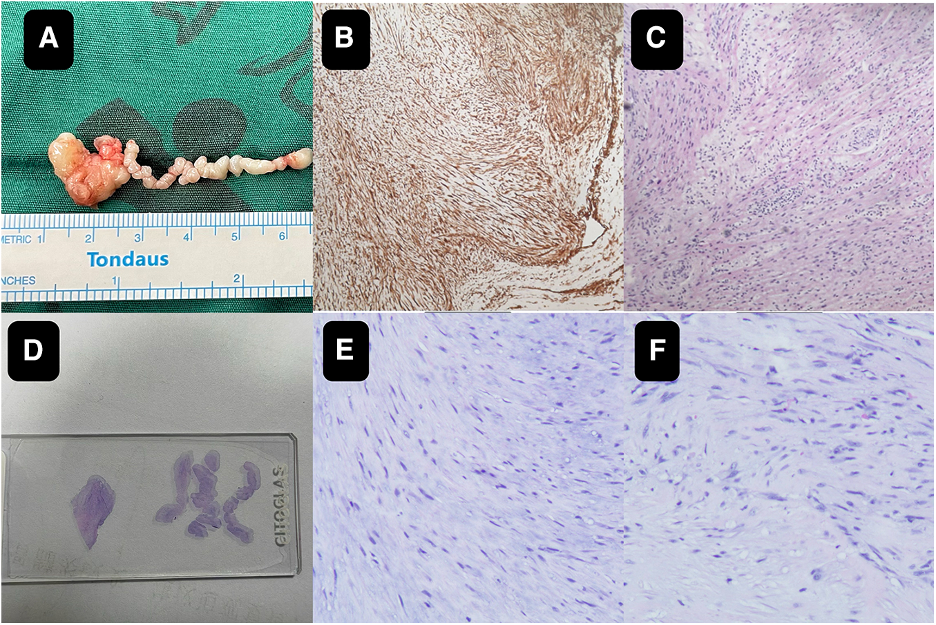 The close-up of the specimen (A) subsequent histopathological analysis confirmed the mass as a cardiac fibroma with myxoid degeneration (B,C). On the pathological slide it shows on the left the mass part and on the right the string part (D) the histology images of the wiggling string part (E) the histology images of the mass part (F).